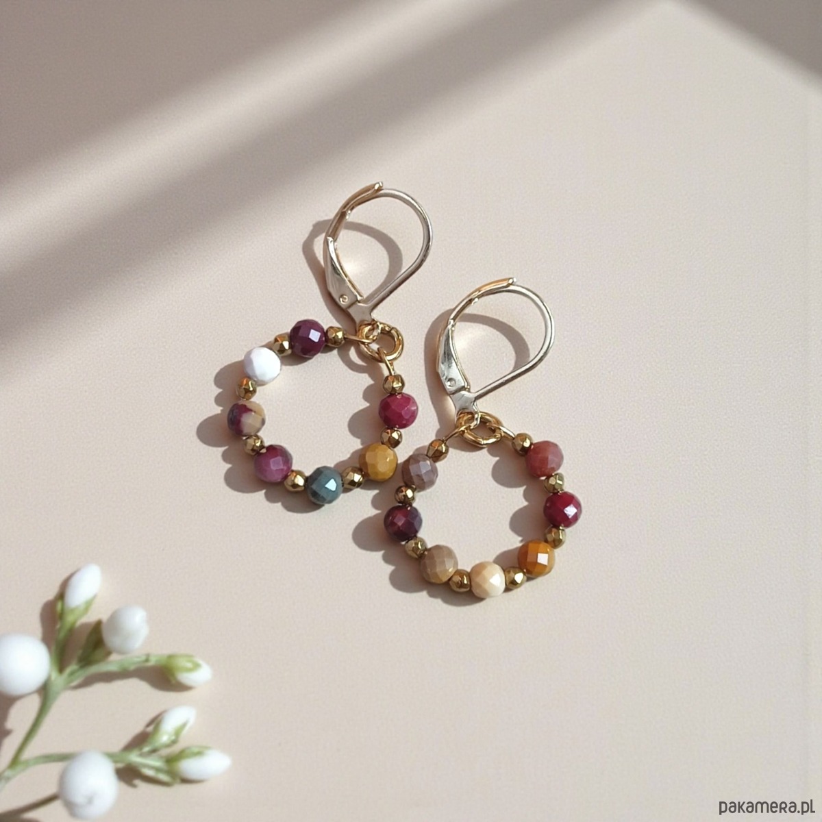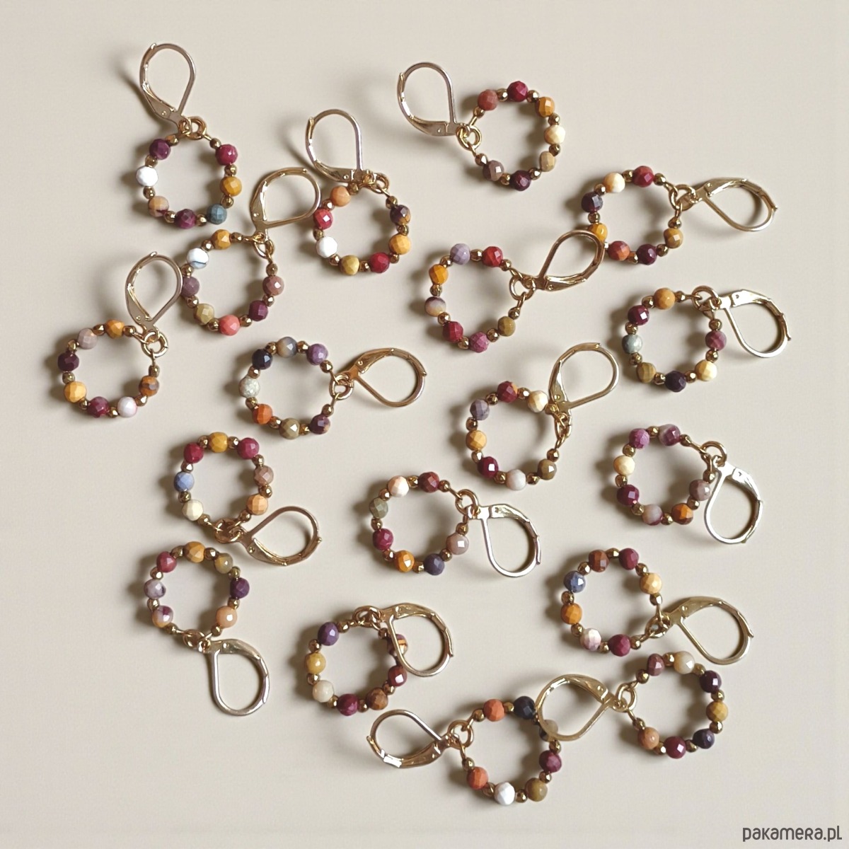 Kolczyki zostały wykonane z fasetowanych kuleczek wielobarwnego mokaitu 4mm i drobniutkich kuleczek złotego hematytu.