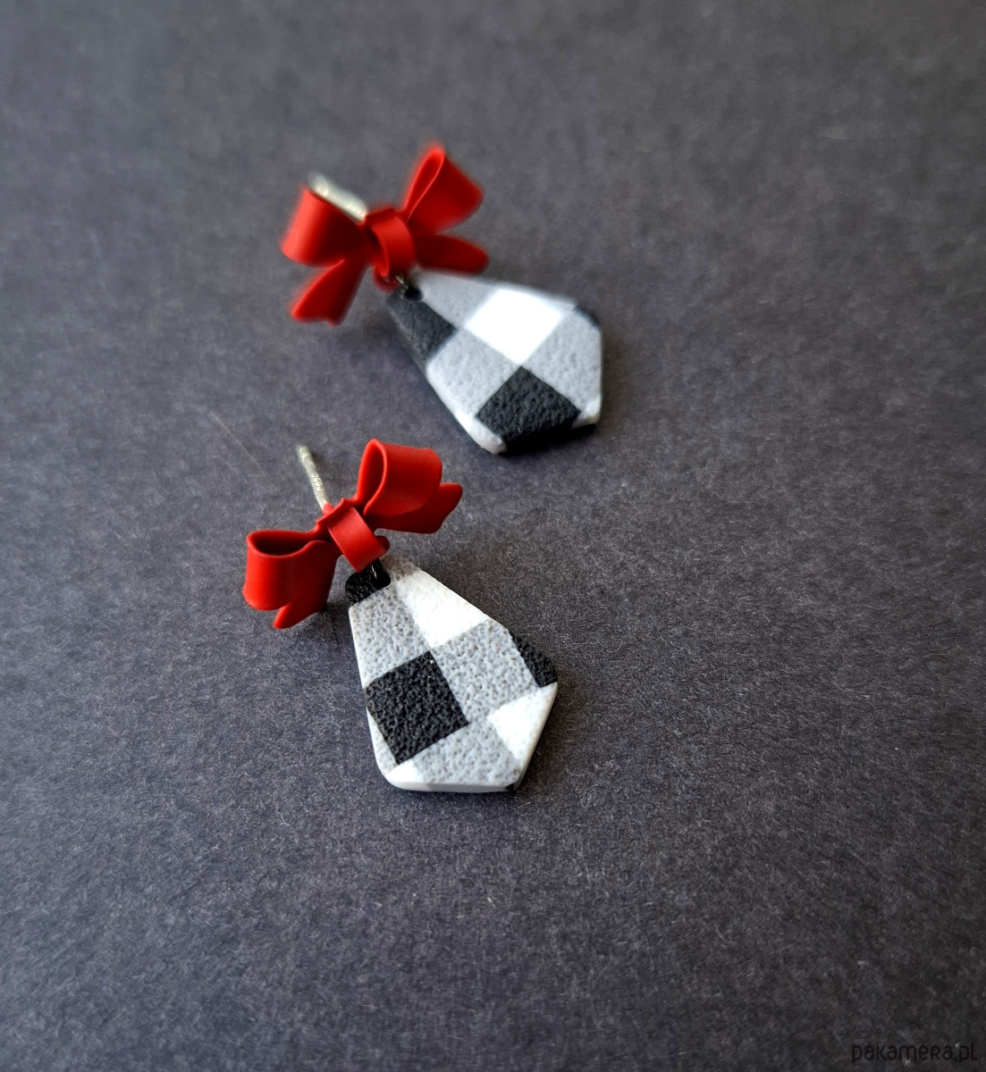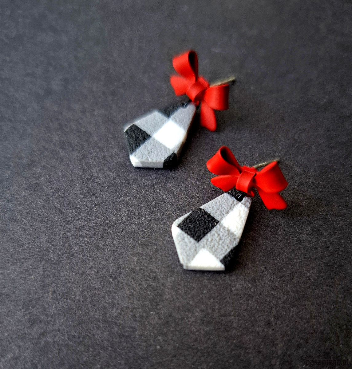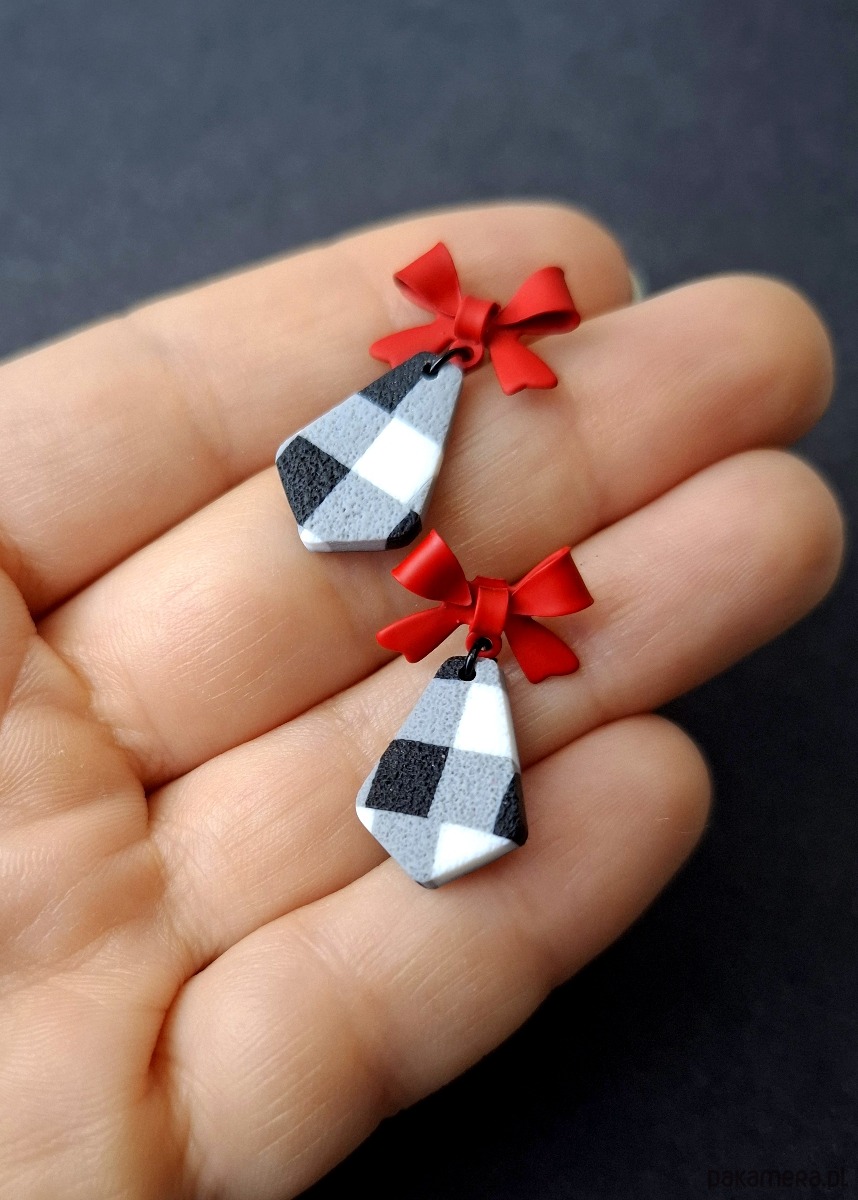 Drobne kolczyki wykonane z wysokiej jakości glinki polimerowej z dodatkiem ozdobnych sztyftów w kształcie kokardek. Jednostronne, ze sztyftami posrebrzanymi i nieuczulającymi. Wykonane w jedynym egzemplarzu. Wymiary: długość wraz z zapięciem: 2,7 cm; szerokość max. 1,2 cm.