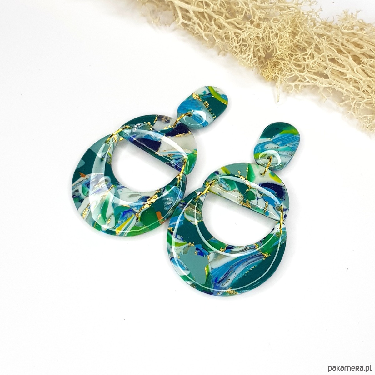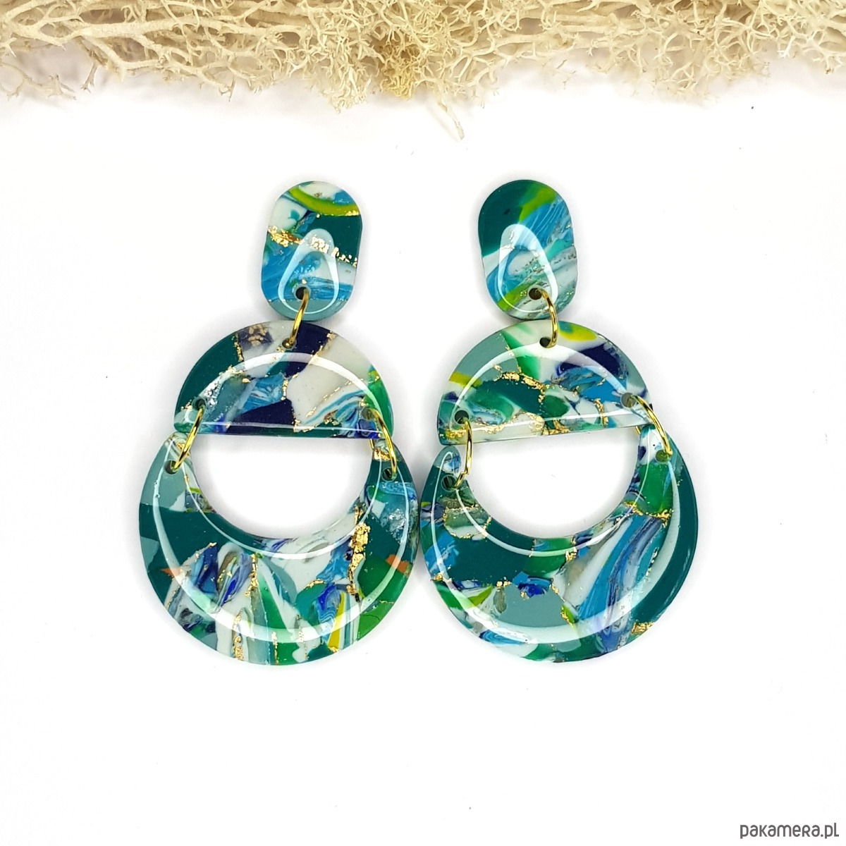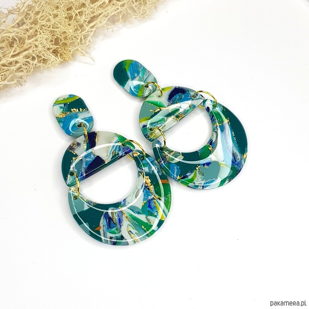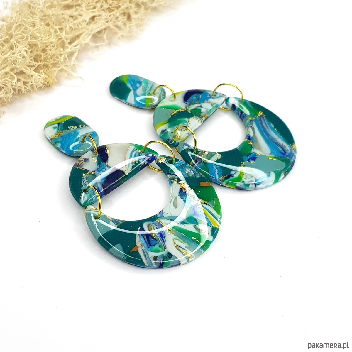 Ręcznie robione kolczyki z glinki polimerowej zachwycają unikalnym połączeniem odcieni błękitu i zieleni, które przywodzą na myśl spokojne wody i głębię natury. Każdy kolczyk składa się z trzech harmonijnie uzupełniających się elementów: podłużnej bazy z wklejonym antyalergicznym sztyftem, półkolistego akcentu oraz delikatnego kształtu księżyca. Elementy te zostały połączone złotymi ogniwkami, które dodają subtelnego blasku i elegancji. Kolczyki mają długość 6,5 cm, dzięki czemu efektownie podkreślają szyję, a jednocześnie pozostają lekkie i wygodne w noszeniu. Pokrycie żywicą epoksydową nadaje im wyjątkowy połysk i sprawia, że są trwałe i odporne na uszkodzenia. Jeśli chciałbyś zamówić podobne kolczyki w innych kolorach, zapraszam do kontaktu – z przyjemnością stworzę coś wyjątkowego specjalnie dla Ciebie!