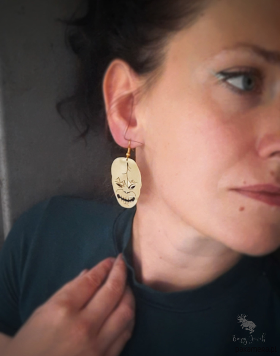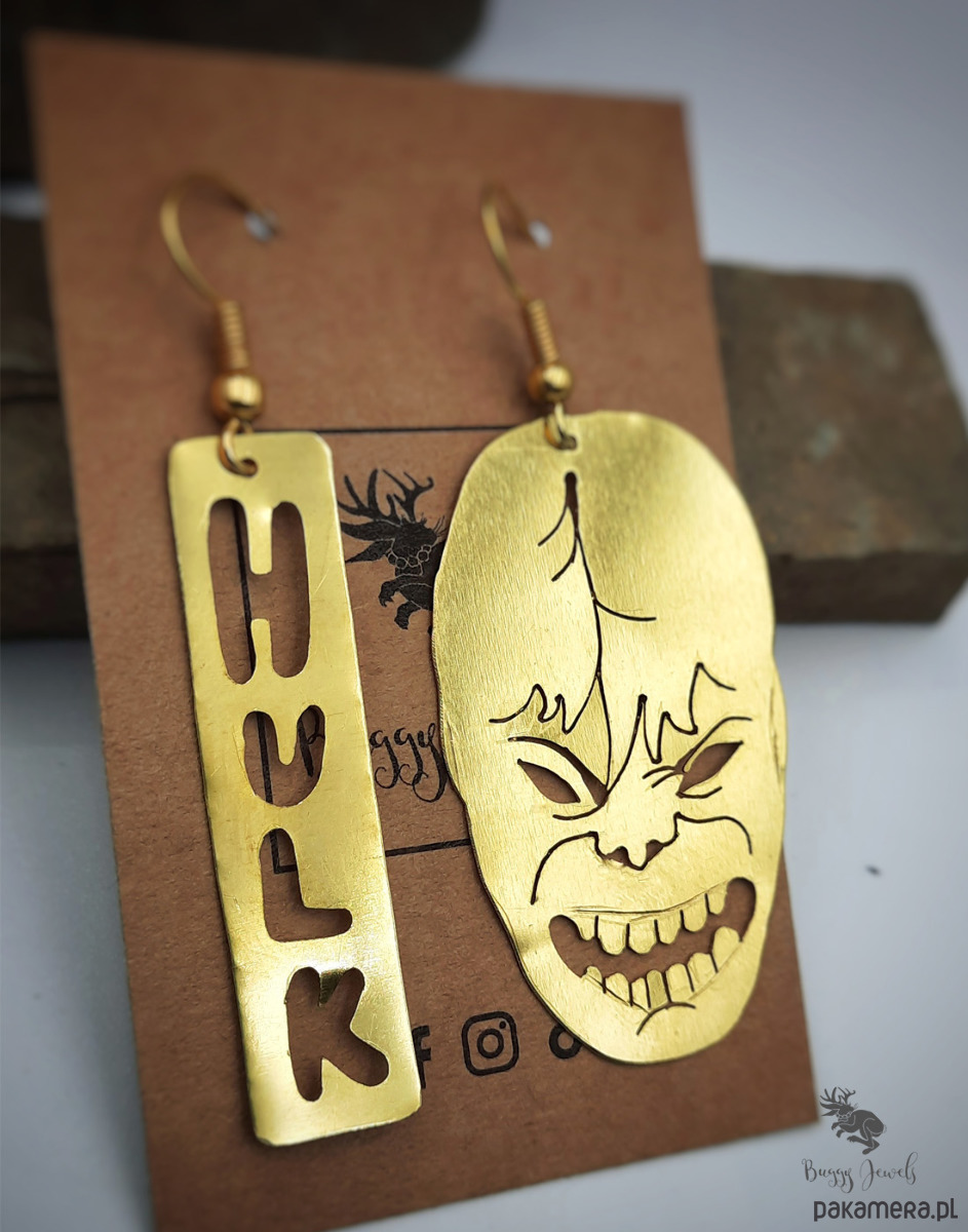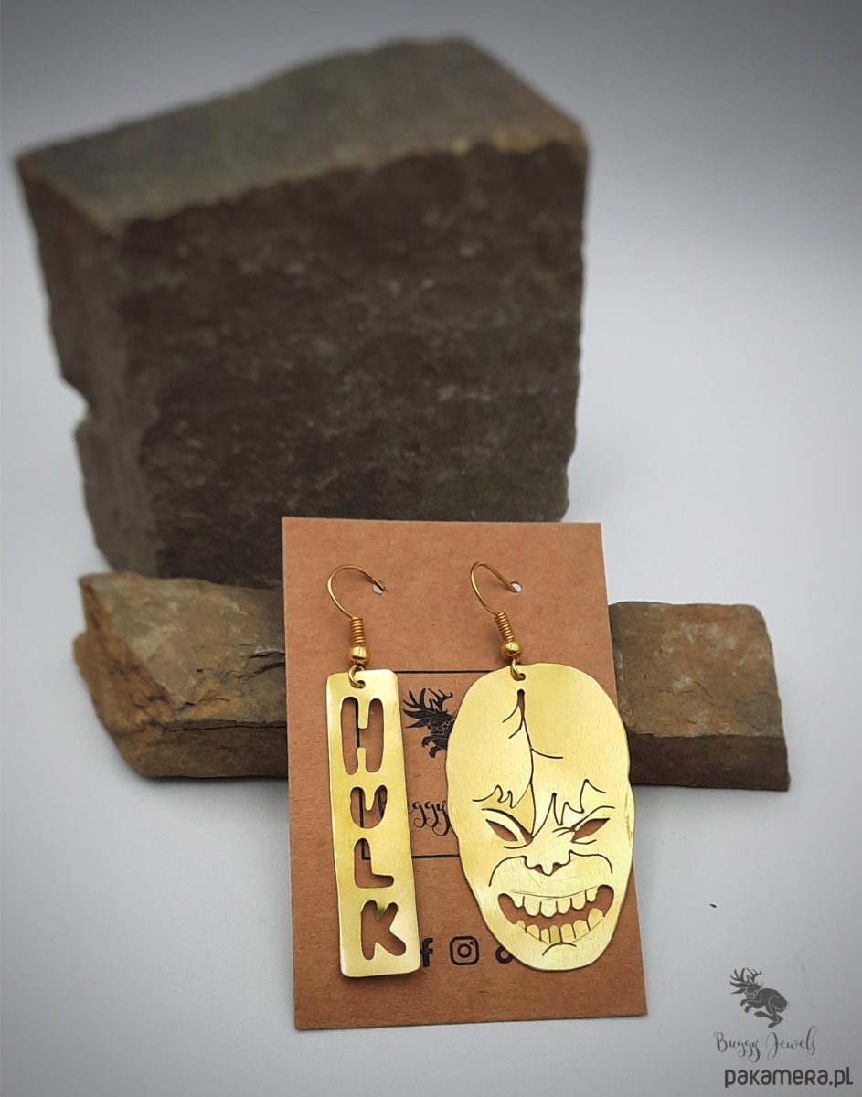 Kolczyki wykonane z cienkiej mosiężnej blaszki , ręcznie wycinane. Proces wykonania kolczyków można obejrzeć na kanale YT oraz Tik Tok. Kolczyki inspirowane filmem Hulk. Kolczyki wykonane dla kobiet kochających filmy Marvela i komiksy. Kolczyki są duże, ale z uwagi na cienki materiał, są także lekkie i wygodne w użytkowaniu. Wykonane w 3 parach, każda para może minimalnie się od siebie różnić.
