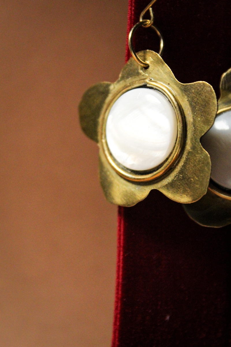 Ręcznie wykonane kolczyki mosiężne z masą perłową.To połączenie stylowego mosiądzu ze stylowym, perłowym blaskiem. Rzemieślniczy i luksusowy dodatek o niepowtarzalnym charakterze.
