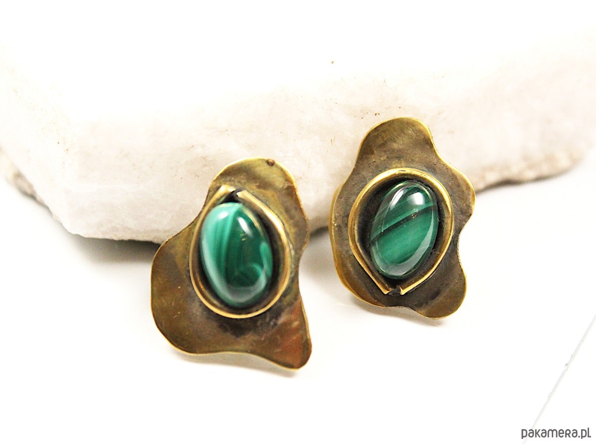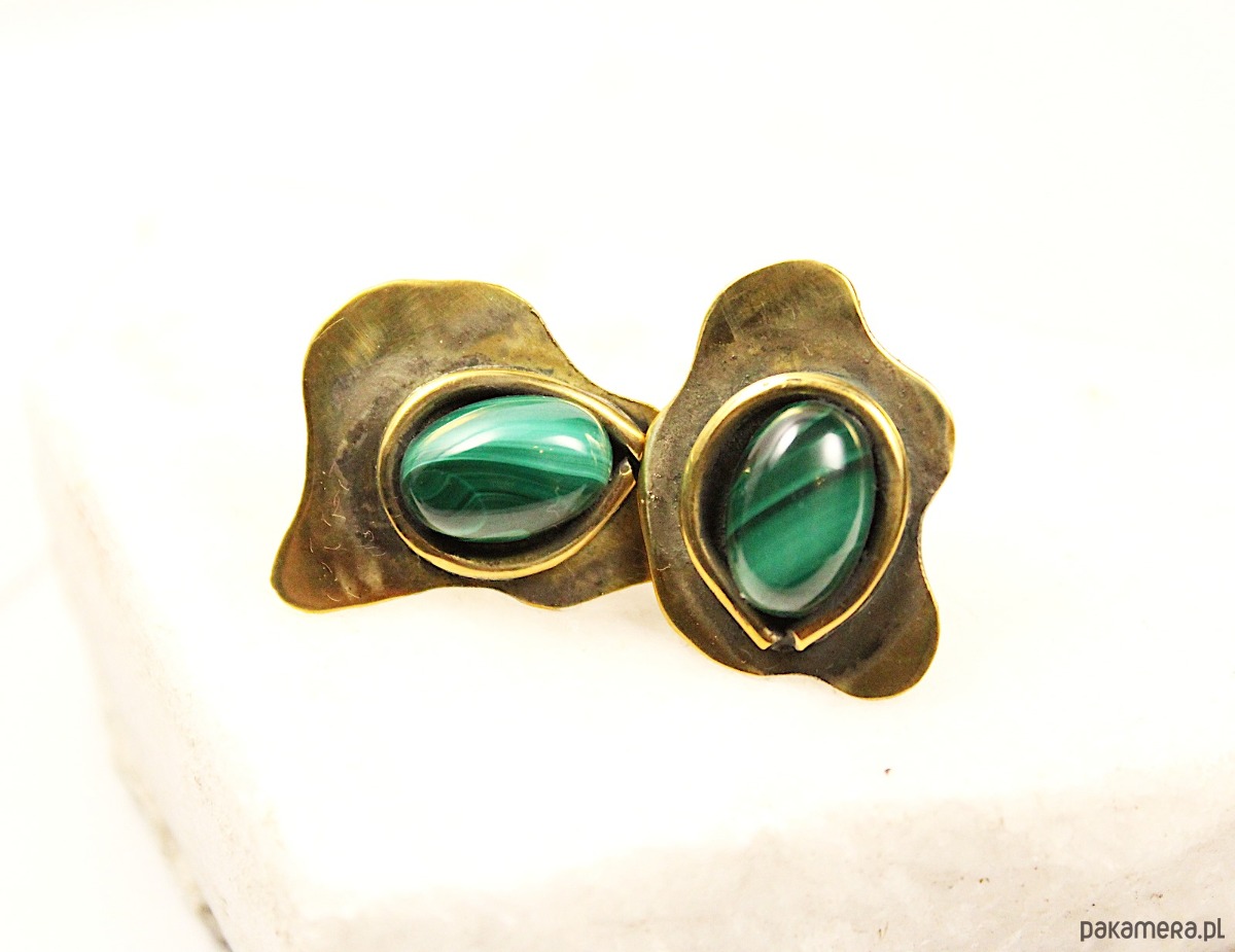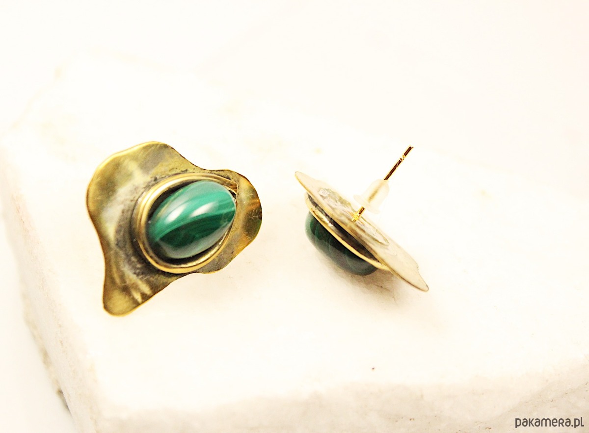 Ręcznie wykonane kolczyki z mosiądzu, których sercem jest naturalny malachit. Nowoczesny, geometryczny kształt dodaje im awangardowej natury i czyni całkowicie niepowtarzalnymi. Kolczyki wykonane są w jednym, oryginalnym egzemplarzu. Mosiądz posiada lekko antyczny i postarzany charakter dzięki czemu każda stylizacja zyska niepowtarzalną wyrazistość.