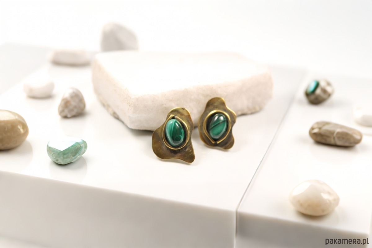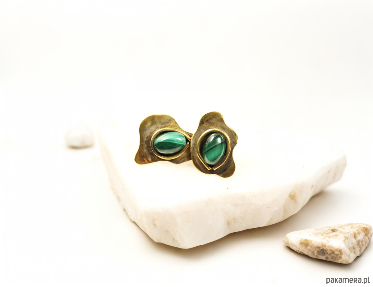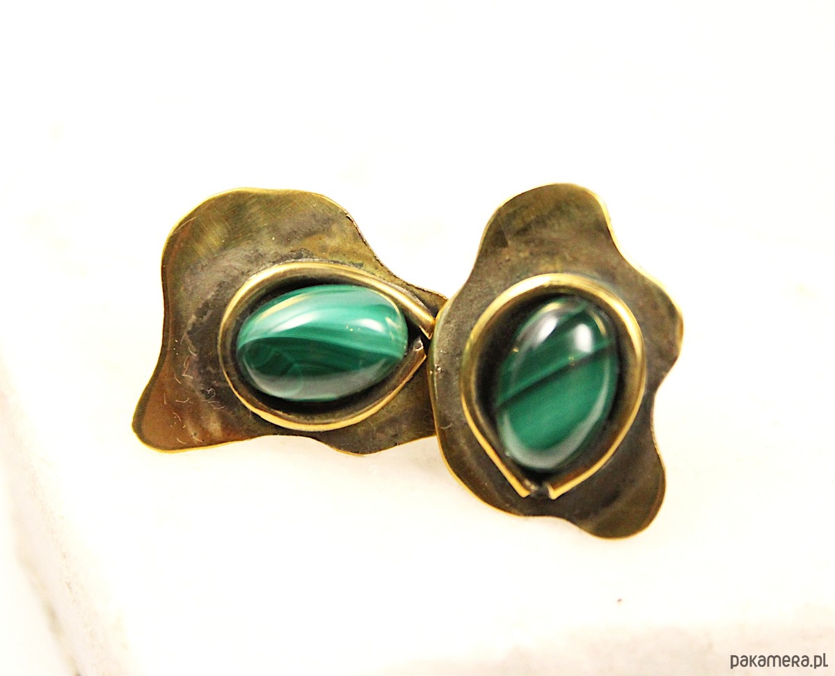 Ręcznie wykonane kolczyki z mosiądzu, których sercem jest naturalny malachit. Nowoczesny, geometryczny kształt dodaje im awangardowej natury i czyni całkowicie niepowtarzalnymi. Kolczyki wykonane są w jednym, oryginalnym egzemplarzu. Mosiądz posiada lekko antyczny i postarzany charakter dzięki czemu każda stylizacja zyska niepowtarzalną wyrazistość.