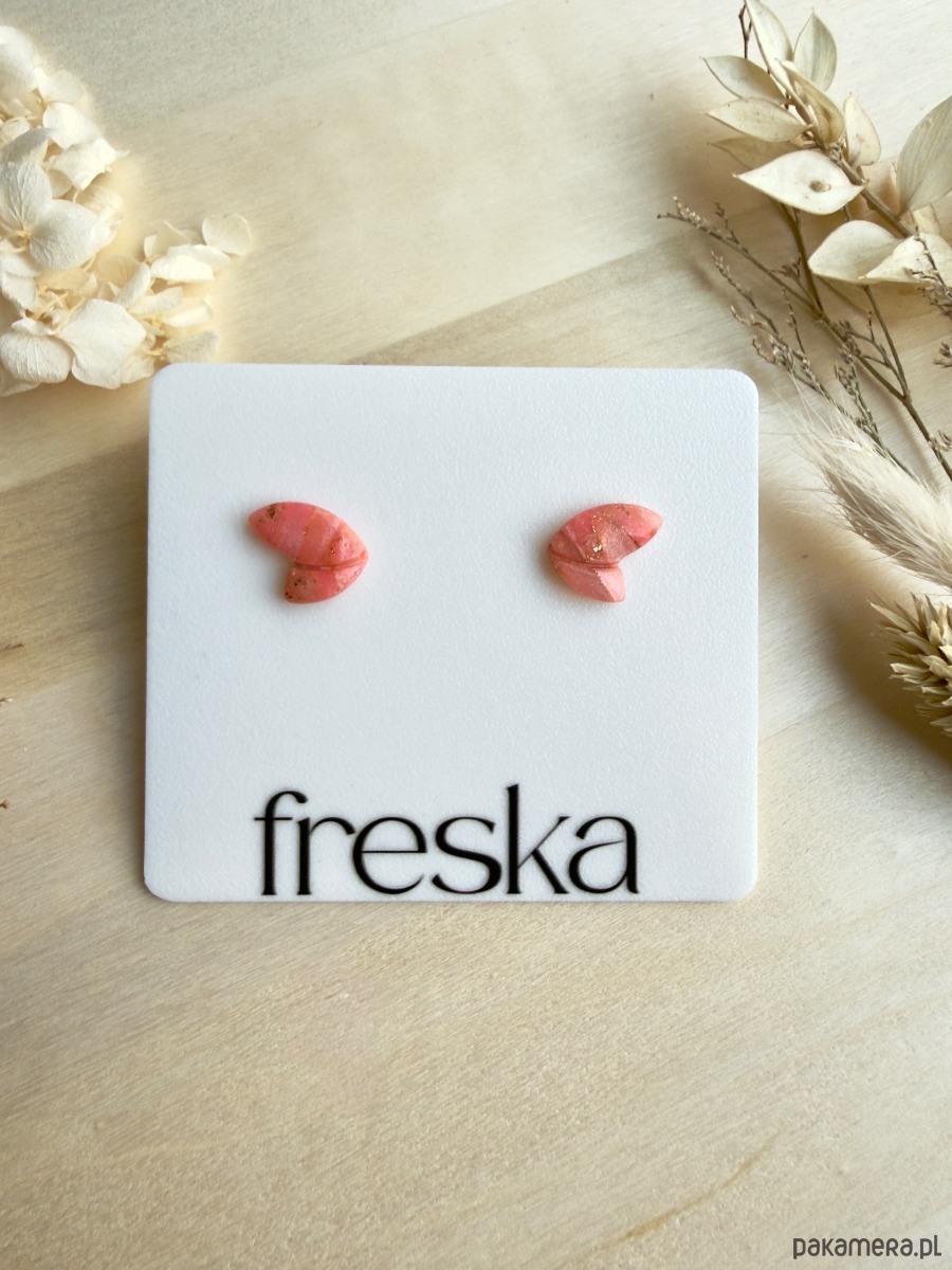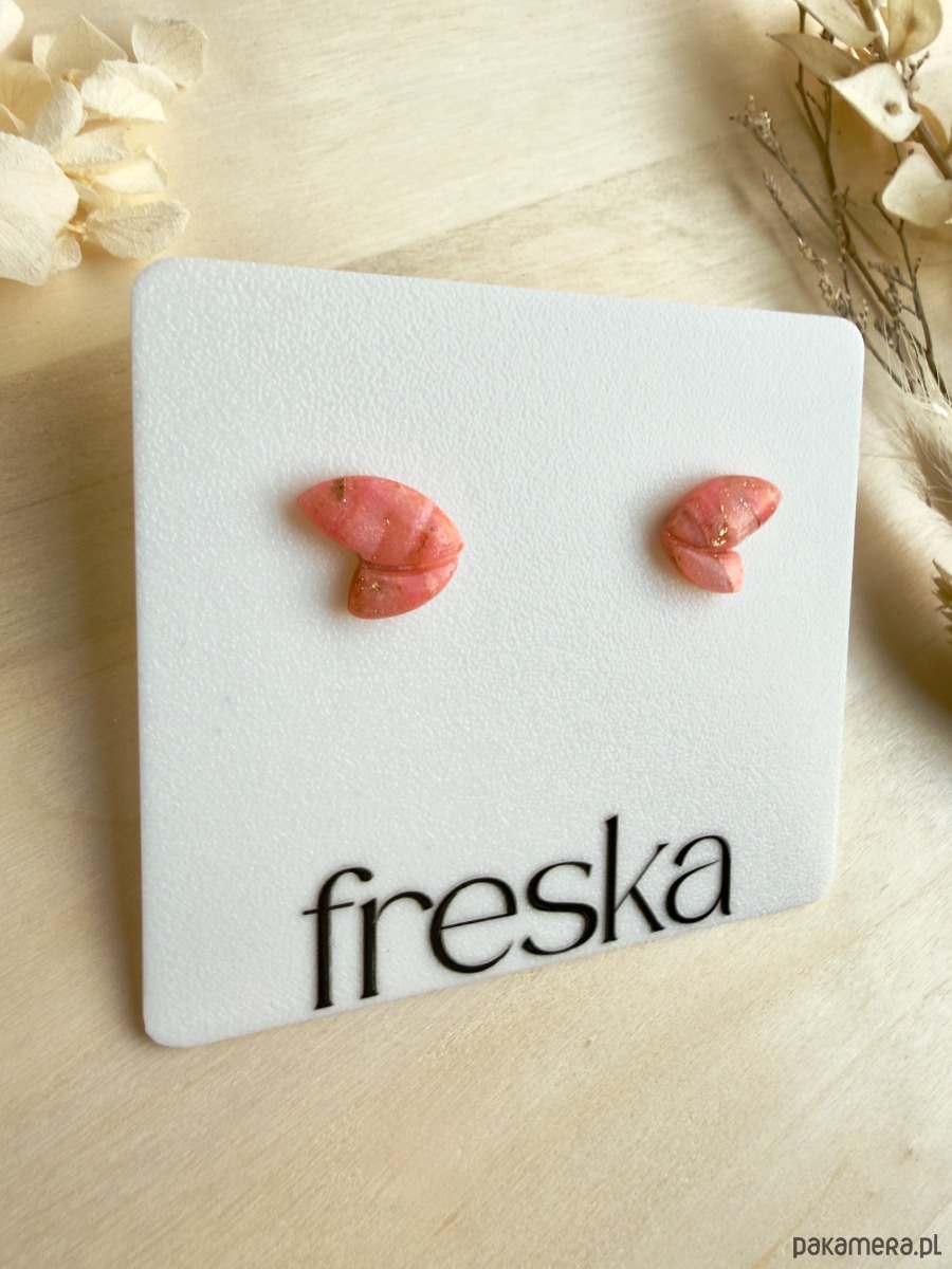 Delikatne kolczyki–motylki w brzoskwiniowym odcieniu to subtelny, dziewczęcy akcent na co dzień. Półkoliście wyprofilowany kształt „skrzydełek” pięknie układa się na uchu, a marmurkowa glina polimerowa z drobnymi złotymi drobinkami dodaje całości lekkiego blasku.
