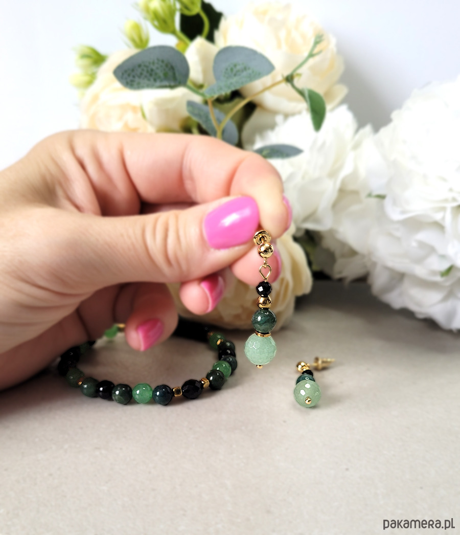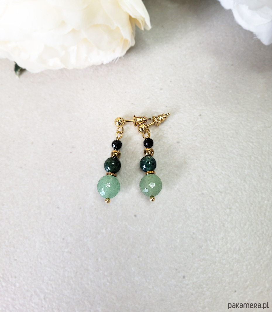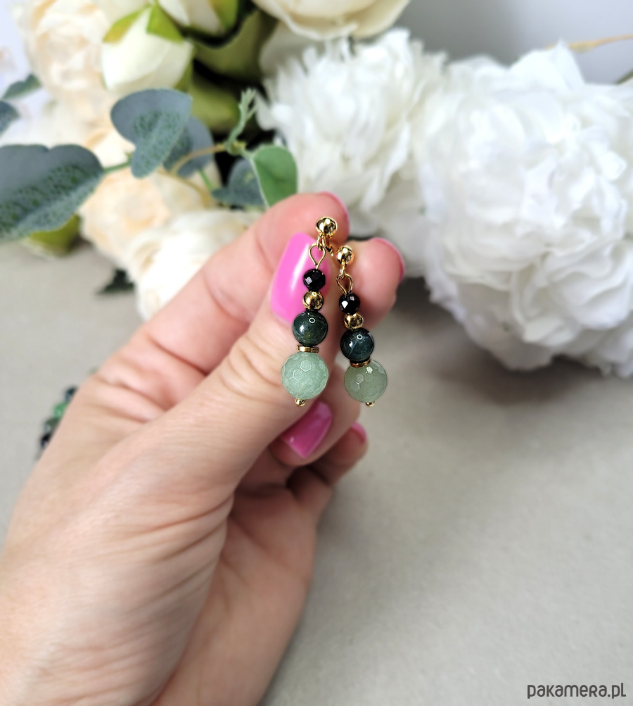 Eleganckie kolczyki zrobione z kamieni naturalnych: Turmalinu czarnego, Awenturynu, Agatu mszystego oraz Hematytu.