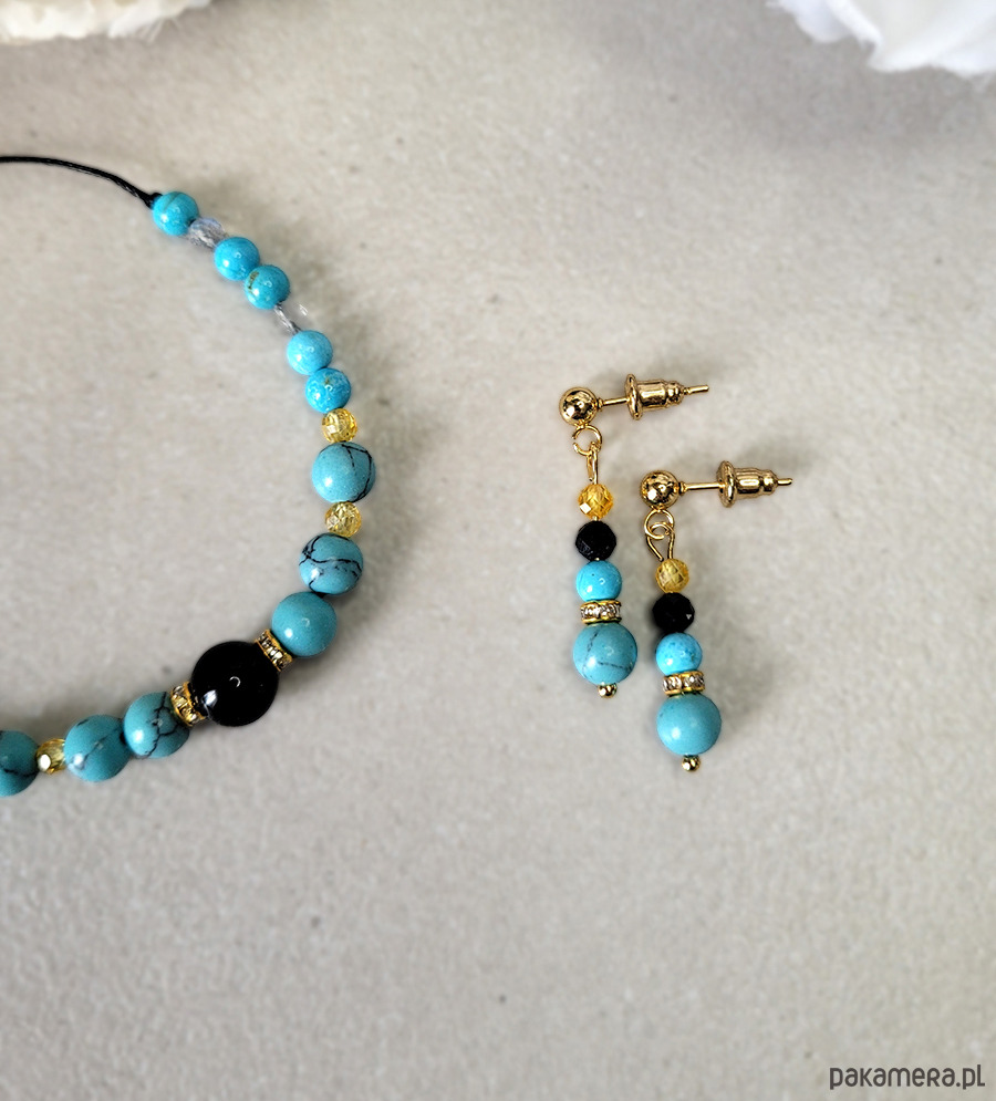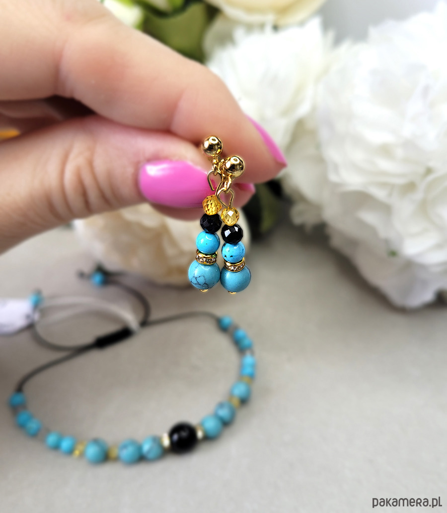 Eleganckie kolczyki zrobione z kamieni naturalnych: Turmalinu czarnego, Turkusu, oraz Cyrkonii.