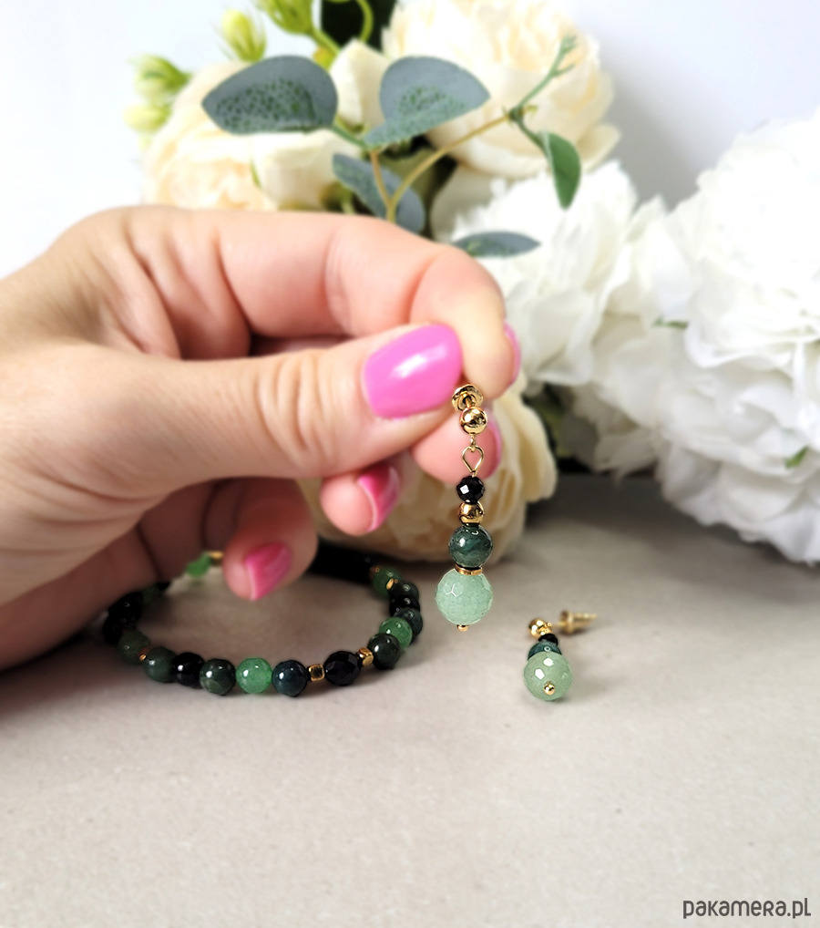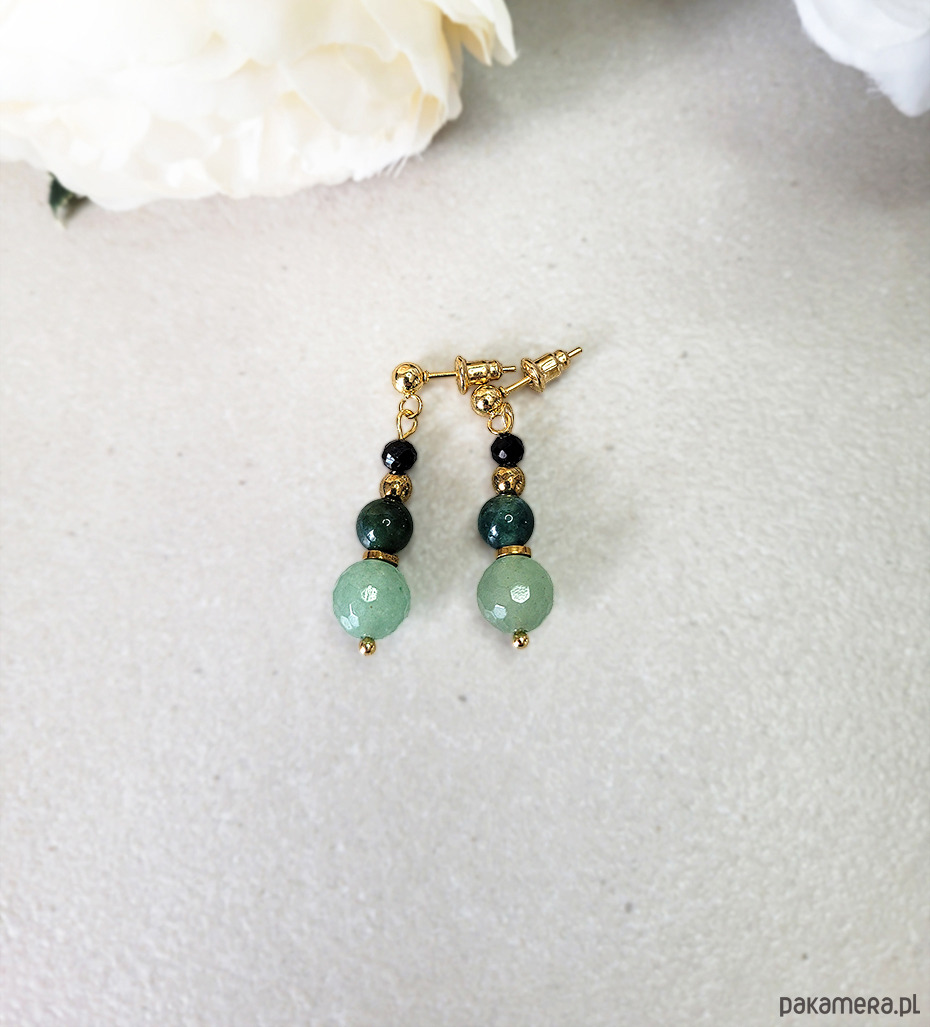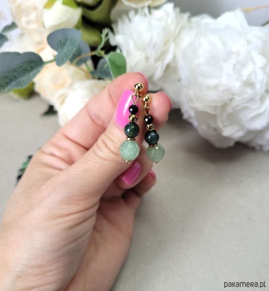 Eleganckie kolczyki zrobione z kamieni naturalnych: Turmalinu czarnego, Awenturynu, Agatu mszystego oraz Hematytu.