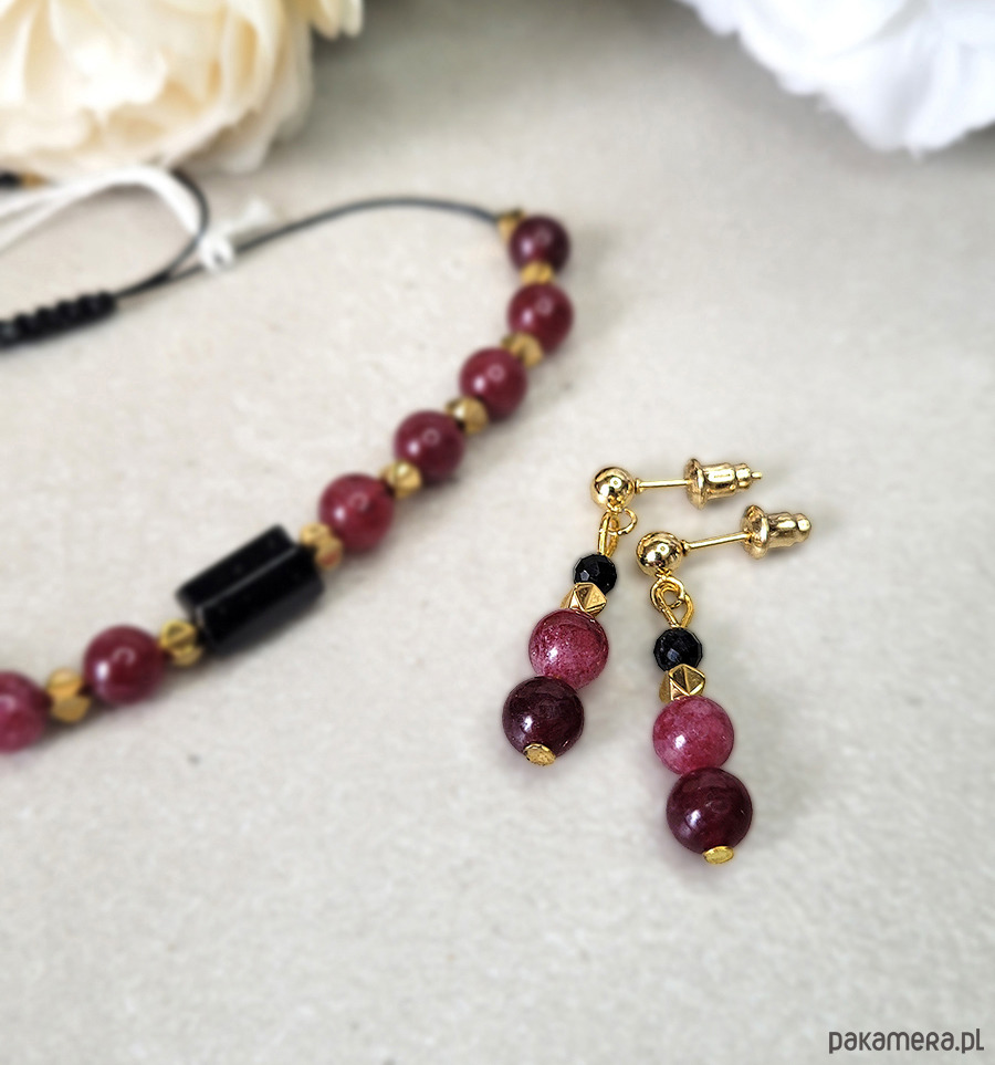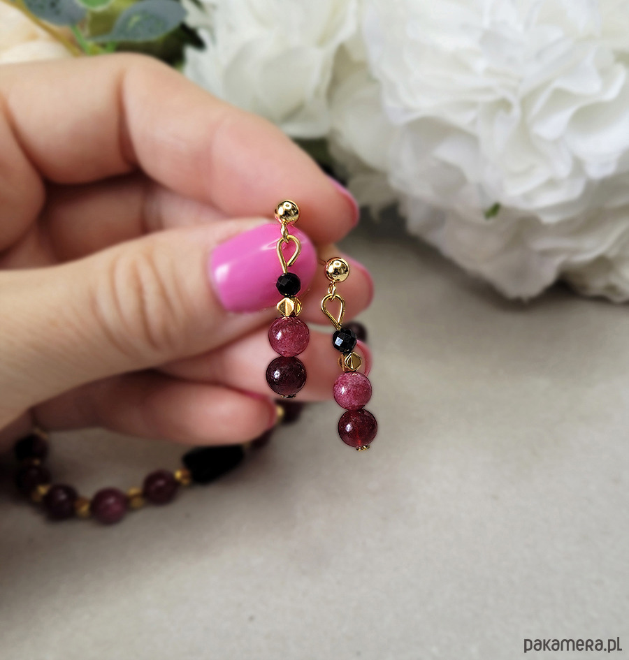 Eleganckie kolczyki zrobione z kamieni naturalnych: Turmalinu czarnego, Granatu oraz Hematytu.