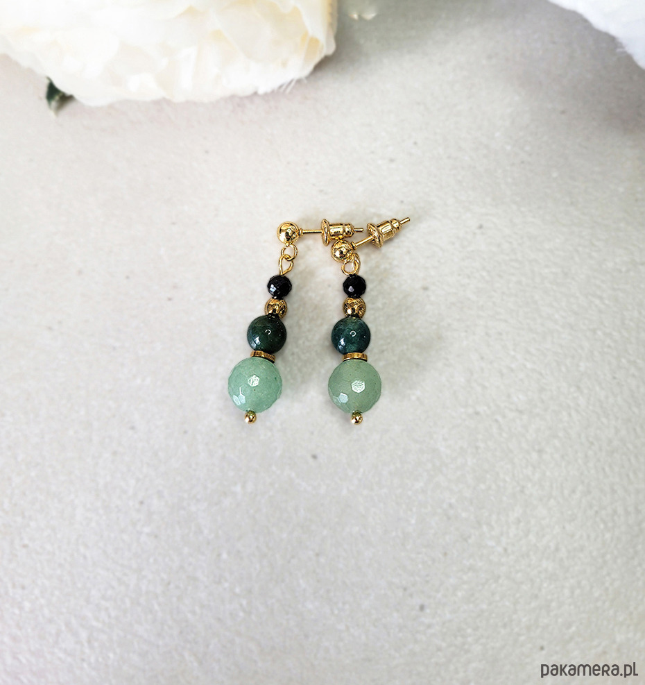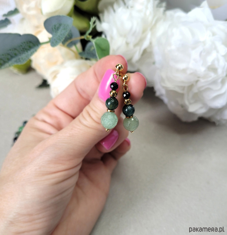Eleganckie kolczyki zrobione z kamieni naturalnych: Turmalinu czarnego, Awenturynu, Agatu mszystego oraz Hematytu.