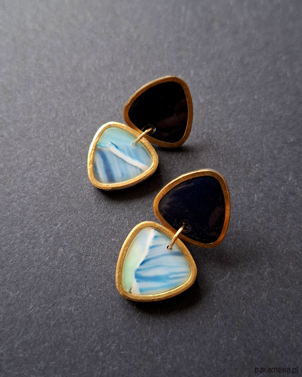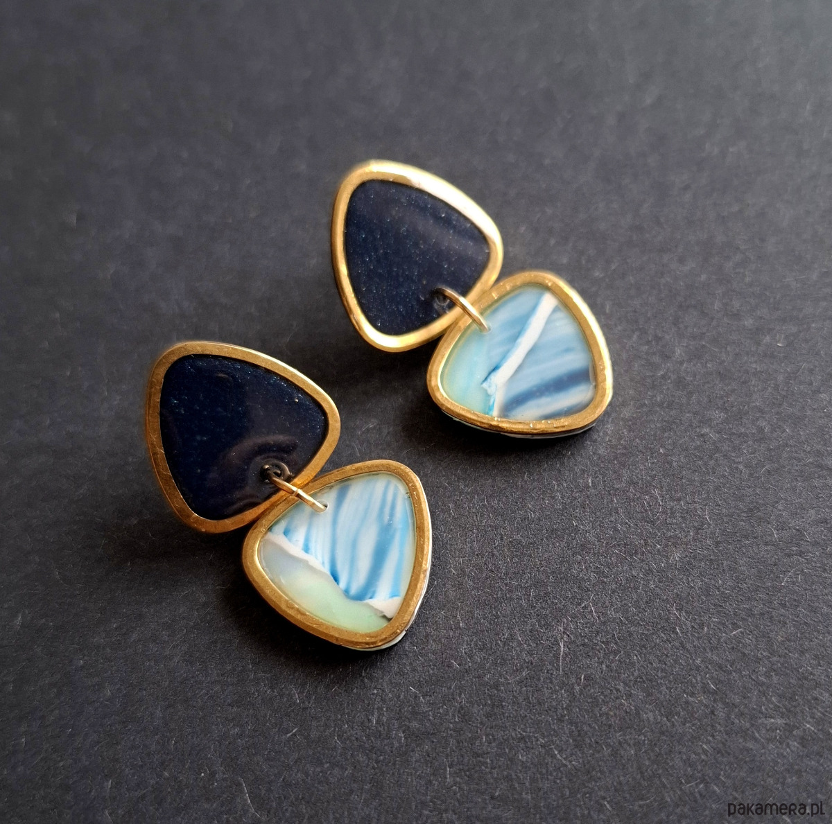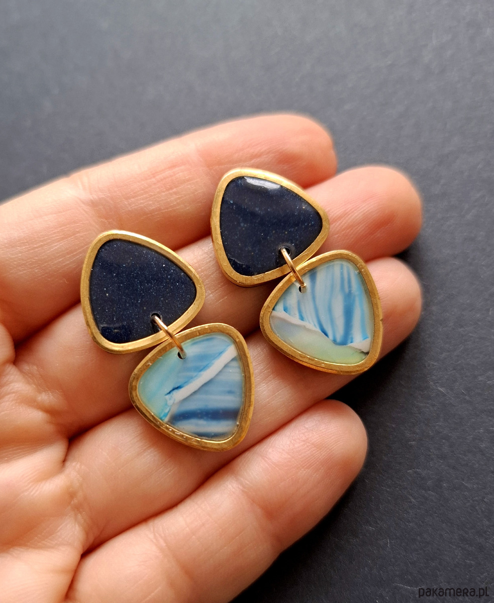Ozdobne sztyfty wykonane z wysokiej jakości glinki polimerowej w połączeniu z ozdobnymi metalowymi elementami w złotym kolorze. Kolczyki jednostronne ze sztyftami pozłacanymi i nieuczulającymi z zapięciem na klasyczne baranki.