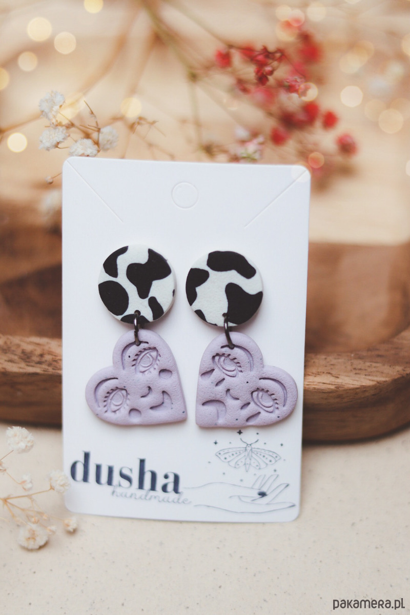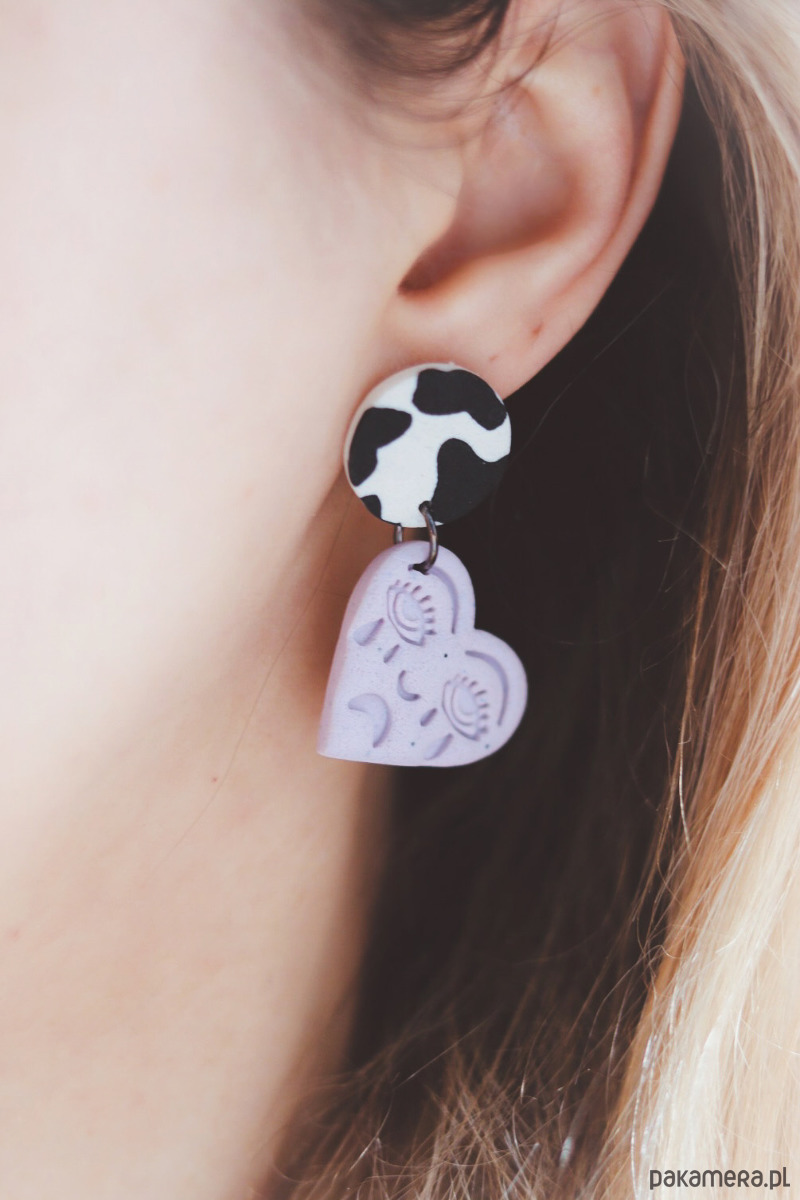Elementy w kształcie serc utrzymane są w delikatnym, liliowym odcieniu fioletu, a okrągłe podstawy ozdobiono łaciatym, czarno-białym wzorkiem.