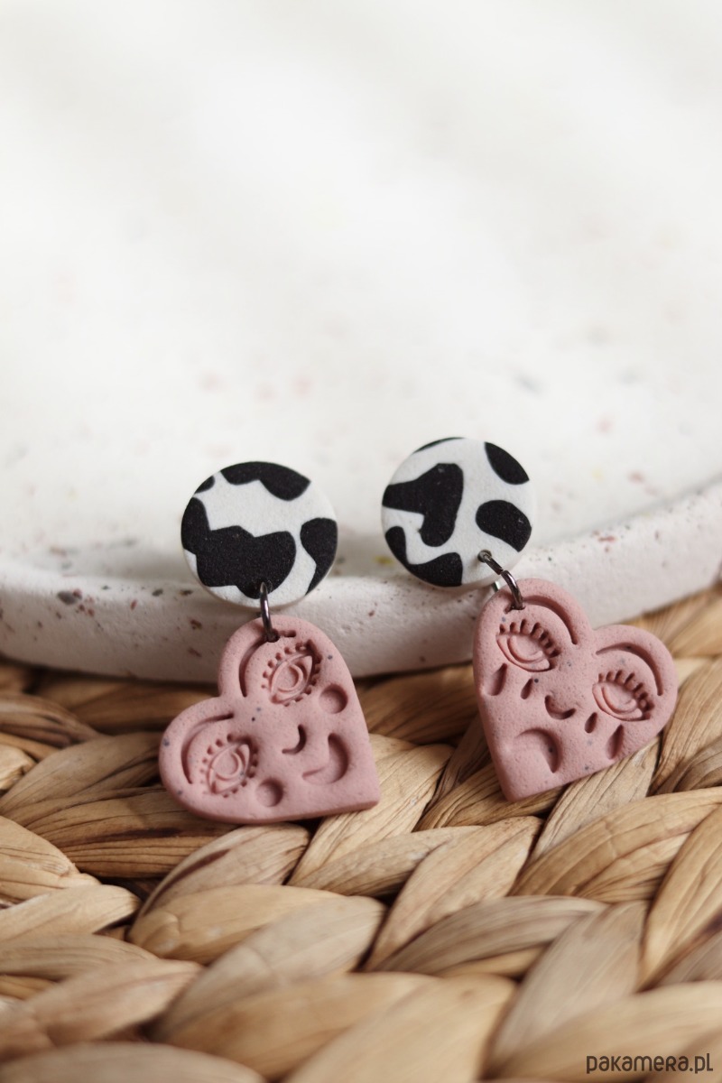 Elementy w kształcie serc utrzymane są w delikatnym, pastelowym odcieniu różu a okrągłe podstawy ozdobiono łaciatym, czarno-białym wzorkiem.