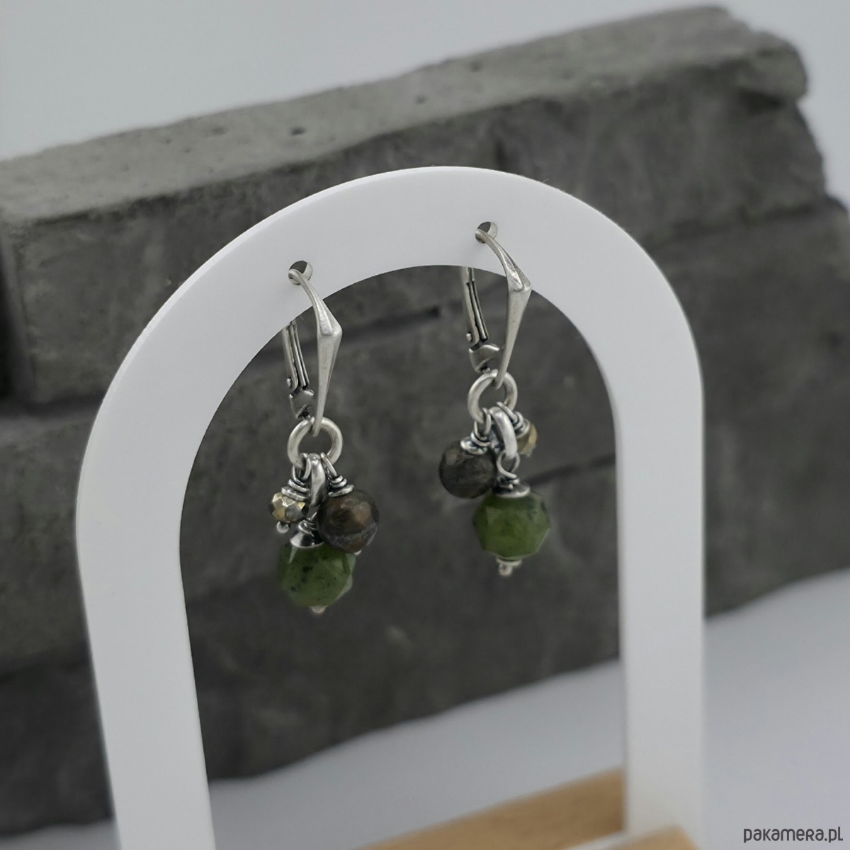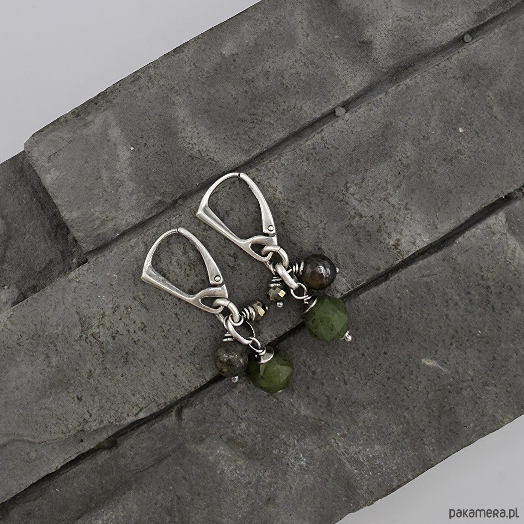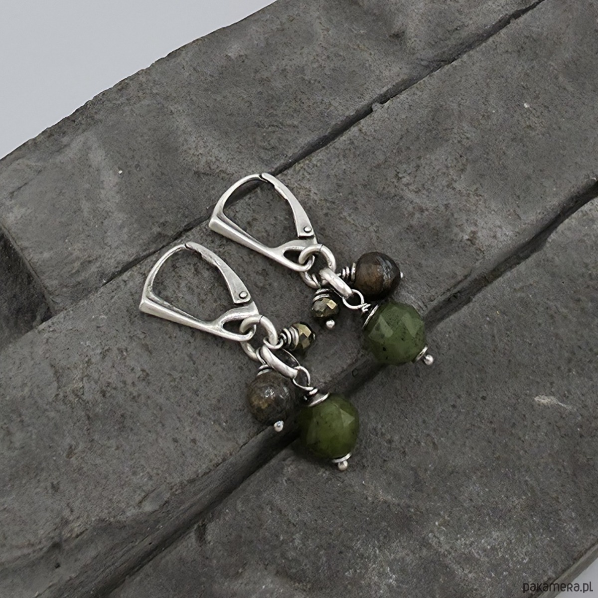 Subtelne i pełne uroku kolczyki na co dzień i nie tylko. Wykonane w całości z oksydowanego srebra próby 925 oraz fasetowanych bryłek nefrytu wiekości 8 mm, fasetowanych kulek bronzytu 6 mm i 4 mm oponek pirytu. Moge wykonac podobne z innymi kamieniami. Całkowita długość kolczyków to 3,8 cm. Ozdobnie zapakowane.