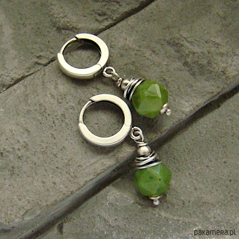 Minimalistyczne kolczyki na co dzień. Wykonane w całości z oksydowanego srebra próby 925 oraz fasetowanych bryłek nefrytu wielkości ok. 0.8-0.9 cm. Zapięcia typu kajdanki, zatrzaskowe. Całkowita długość kolczyków to ok. 3 cm. Ozdobnie zapakowane.