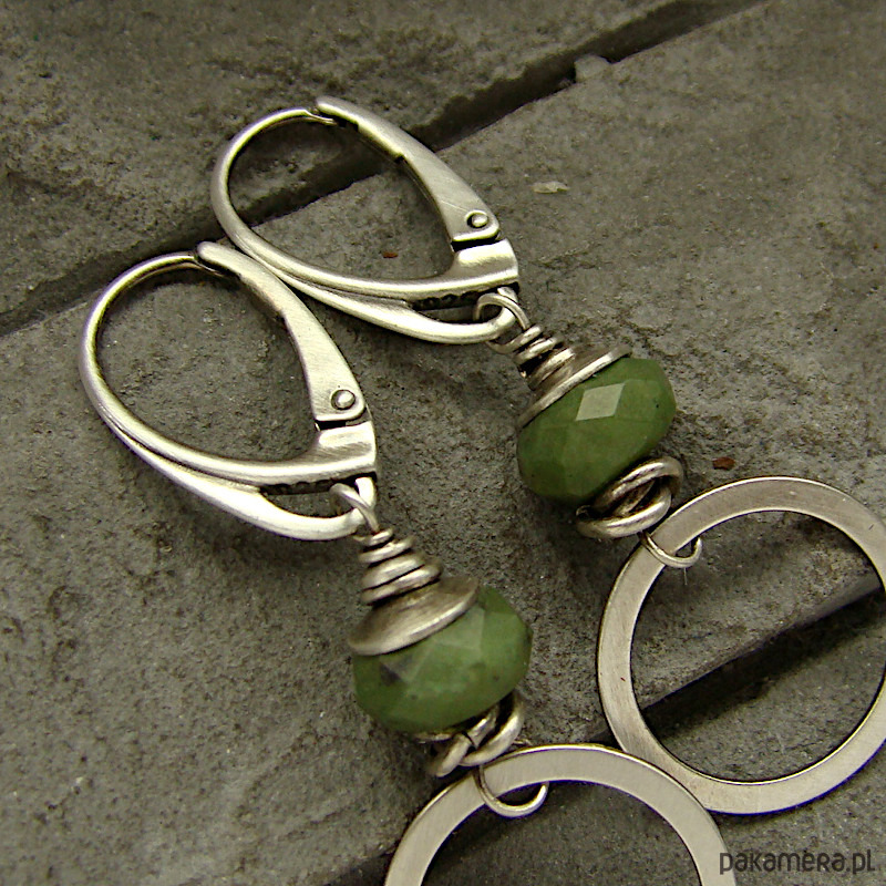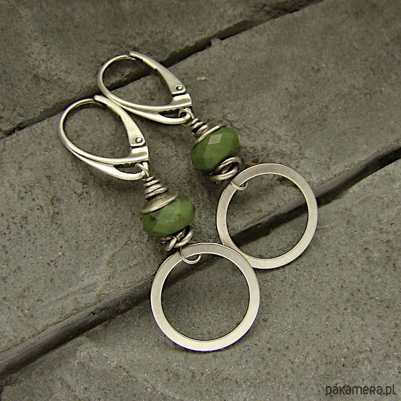 Minimalistyczne, nowoczesne i oryginalne kolczyki na co dzień. Wykonane w całości ze srebra próby 925 oraz fasetowanych oponek nefrytu wielkości 0.8 cm. Całkowita długość kolczyków to ok. 4,8 cm. Ozdobnie zapakowane.