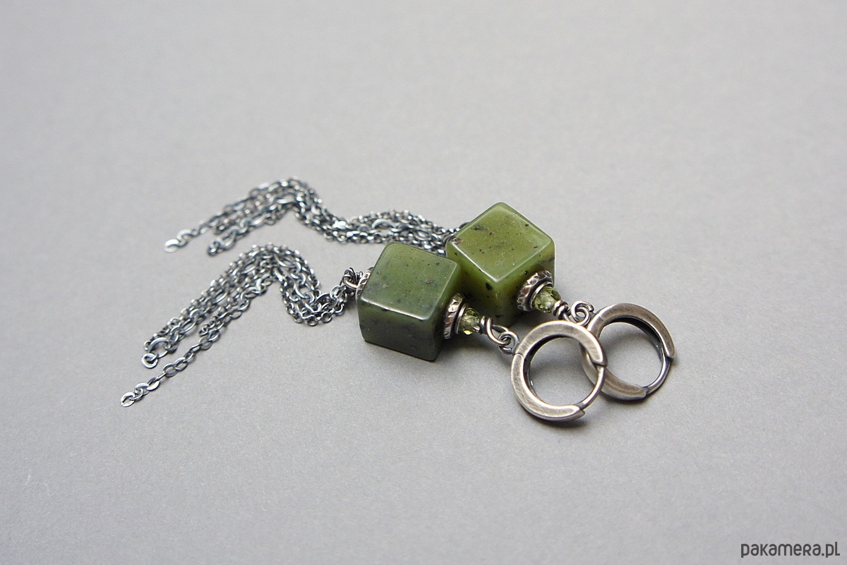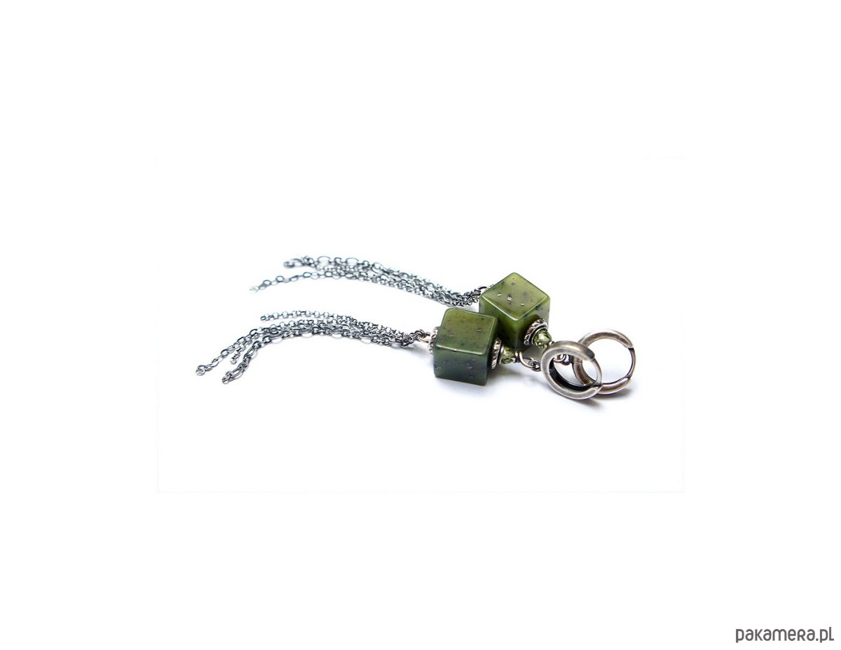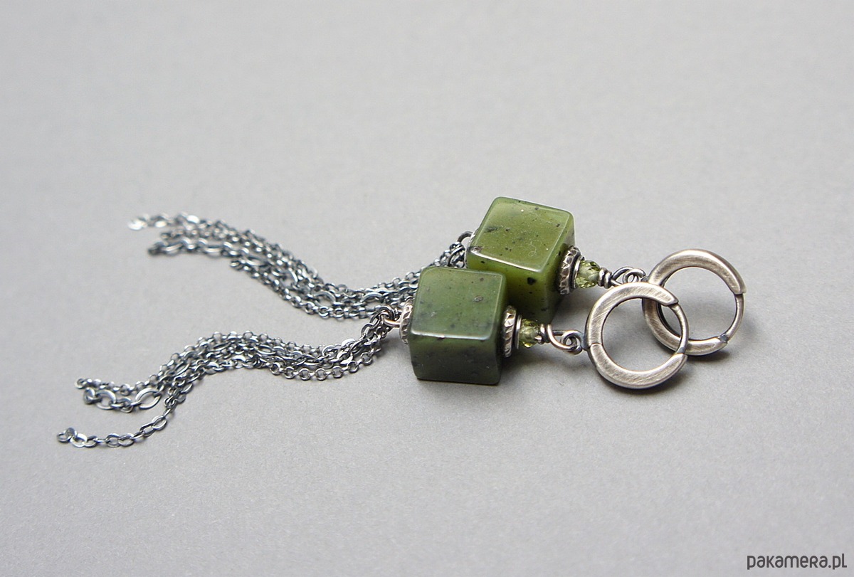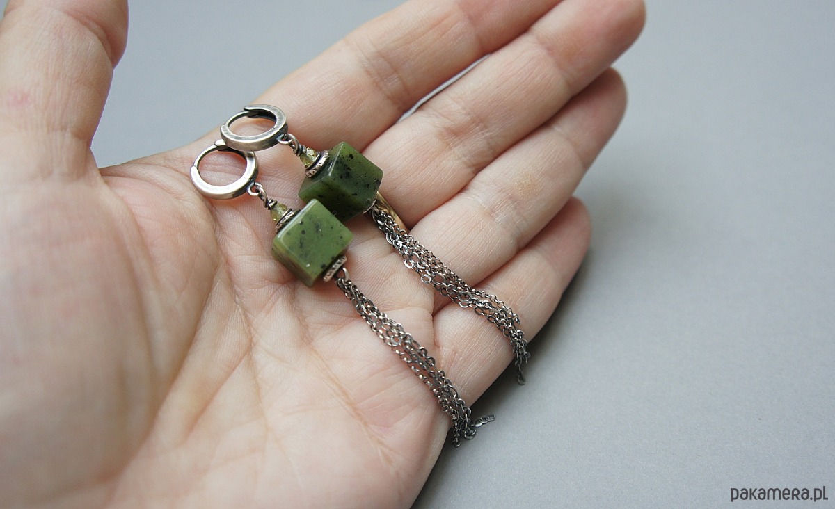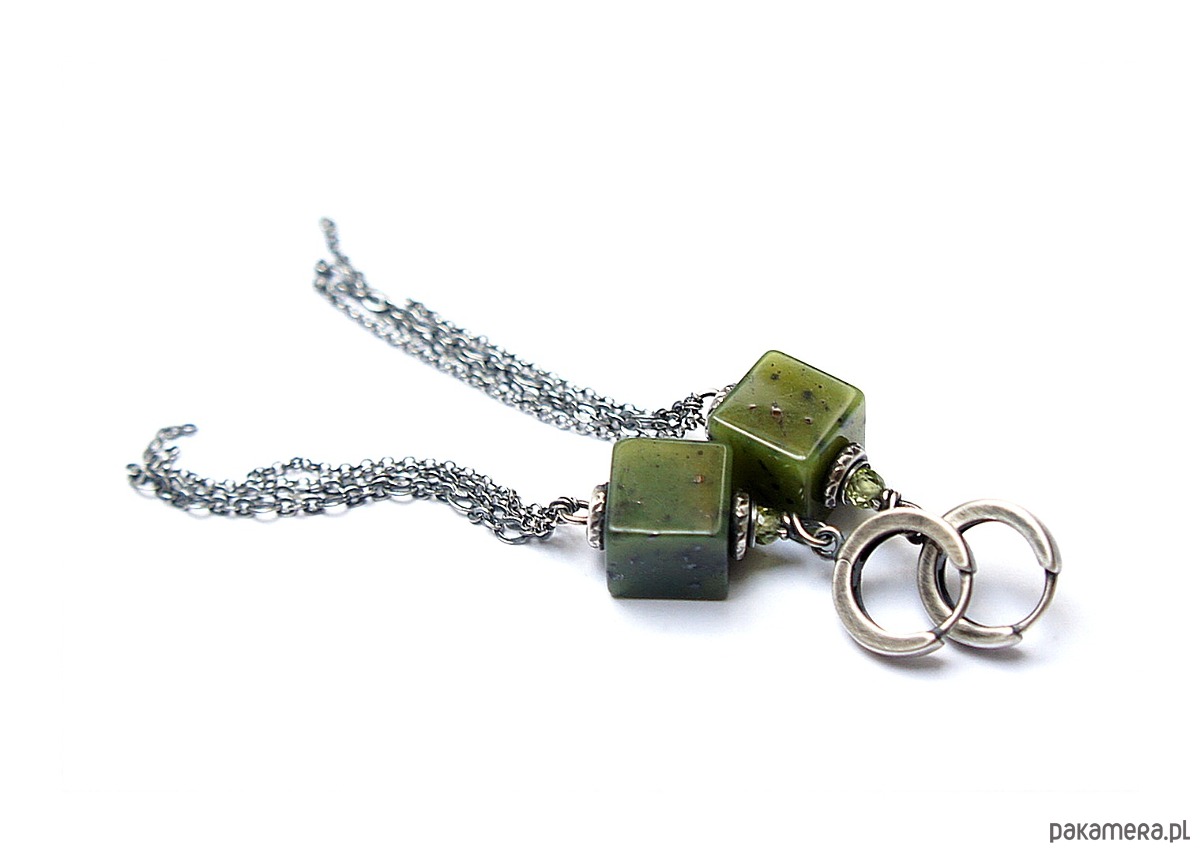 Kolczyki wykonane ze srebra [pr. 925] w połączeniu z kostkami nefrytów [10mm x 10mm],fasetowanymi kuleczkami peridotów [3mm] oraz łańcuszkami. Całość oksydowana i przetarta. Całkowita długość kolczyków 8,7cm. Biżuteria ozdobnie zapakowana.