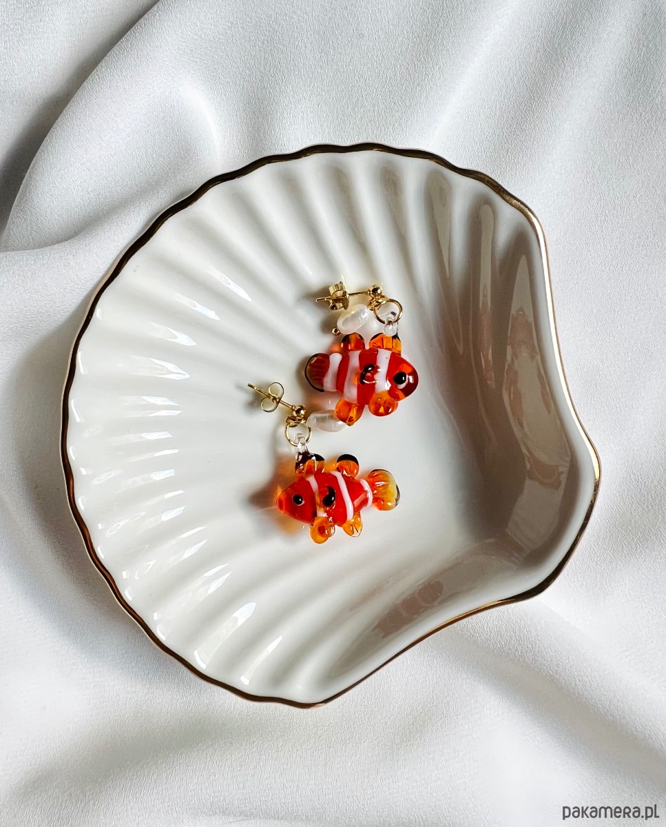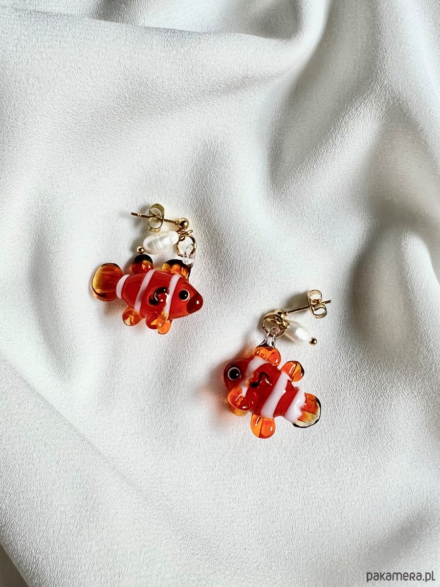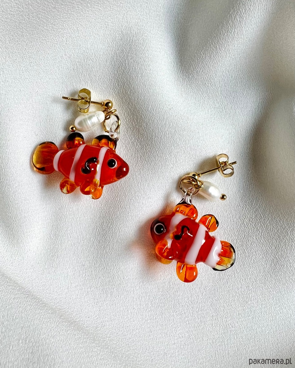 Wyjątkowe, kolorowe kolczyki z morskim akcentem - piękną pomarańczową rybką, ręcznie wykonaną ze szkła, w towarzystwie małej perełki naturalnej hodowlanej.