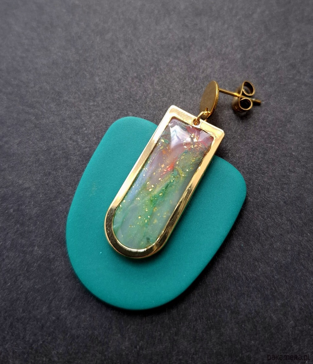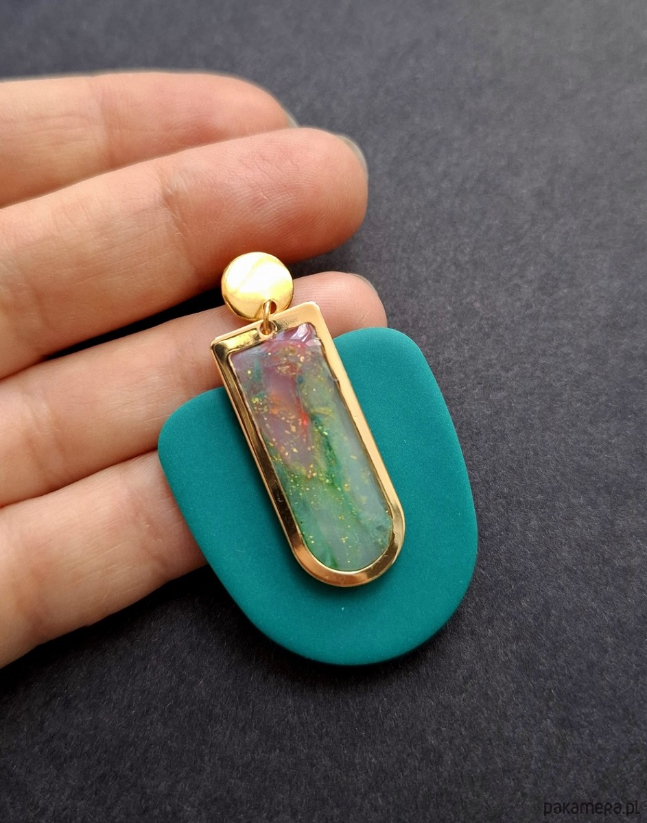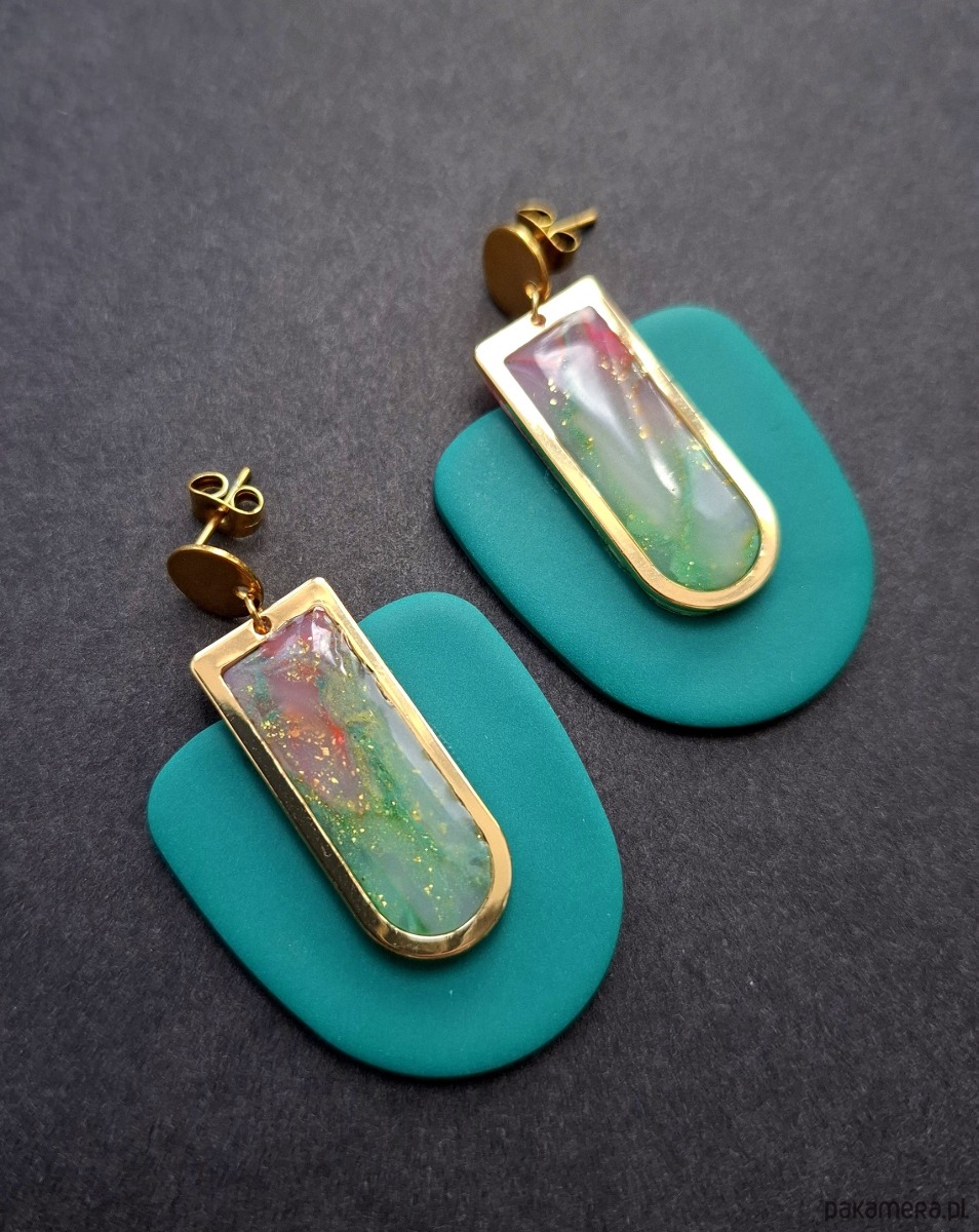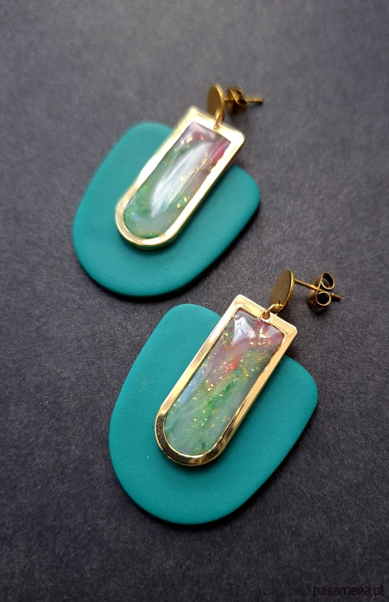 Kolczyki na sztyfty wykonane z wysokiej jakości glinki polimerowej z dodatkiem ozdobnych elementów metalowych. Sztyfty pozłacane i nieuczulające. Wymiary kolczyków: długość całkowita: 5 cm, szerokość max. 3,2 cm. Wykonane w jedynym egzemplarzu.