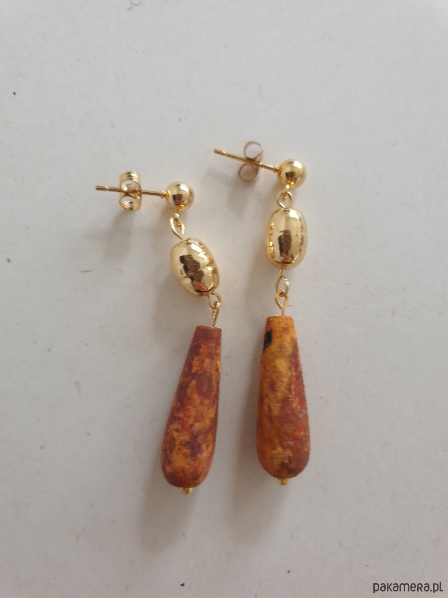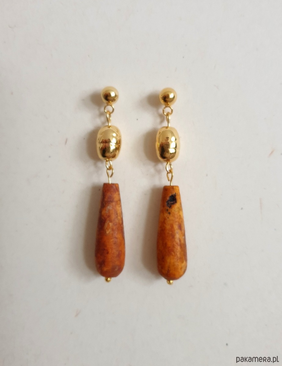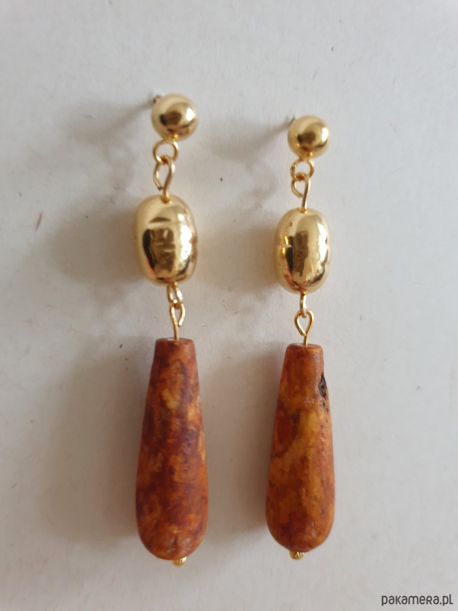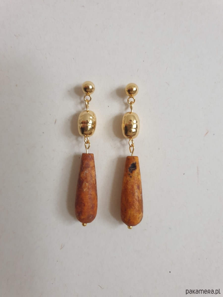 Materiał: Stal szlachetna złocona (sztyfty), nieregularne koraliki z surowego mosiądzu, agat brązowy