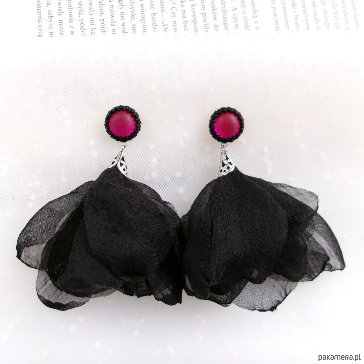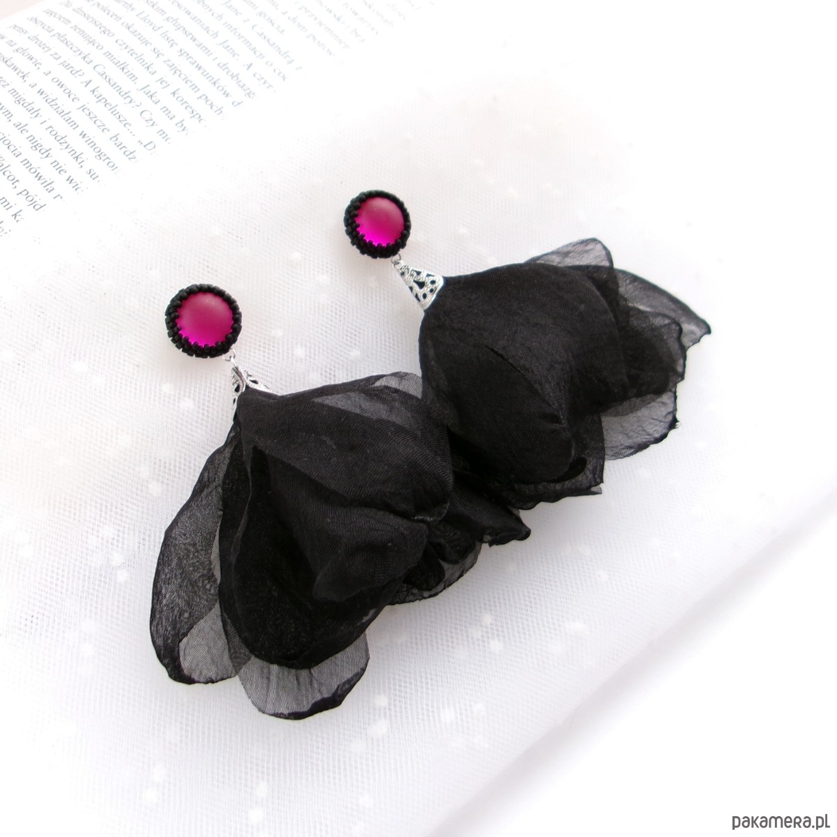 Wykończone czarnymi szyfonowymi kwiatami, dzięki którym kolczyki są bardzo lekkie.