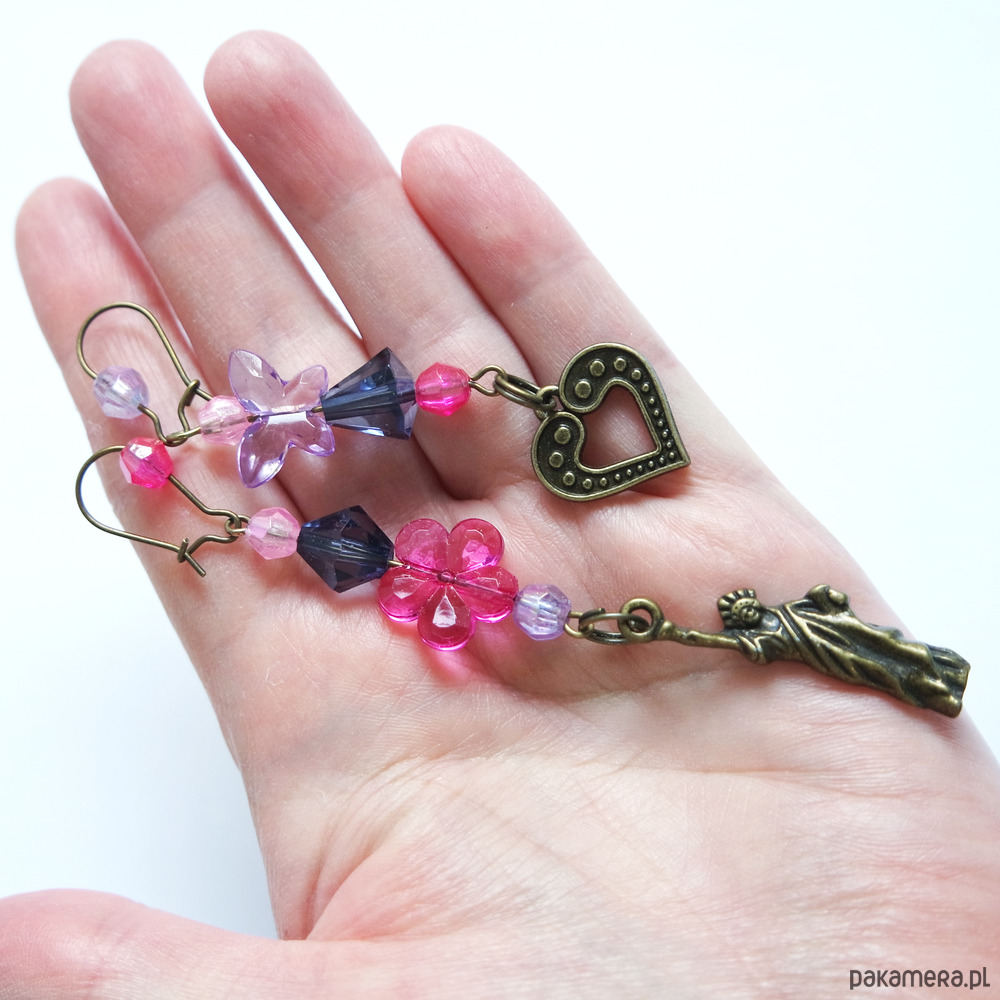 Kolczyki z kompozycją z koralików oraz zawieszkami.