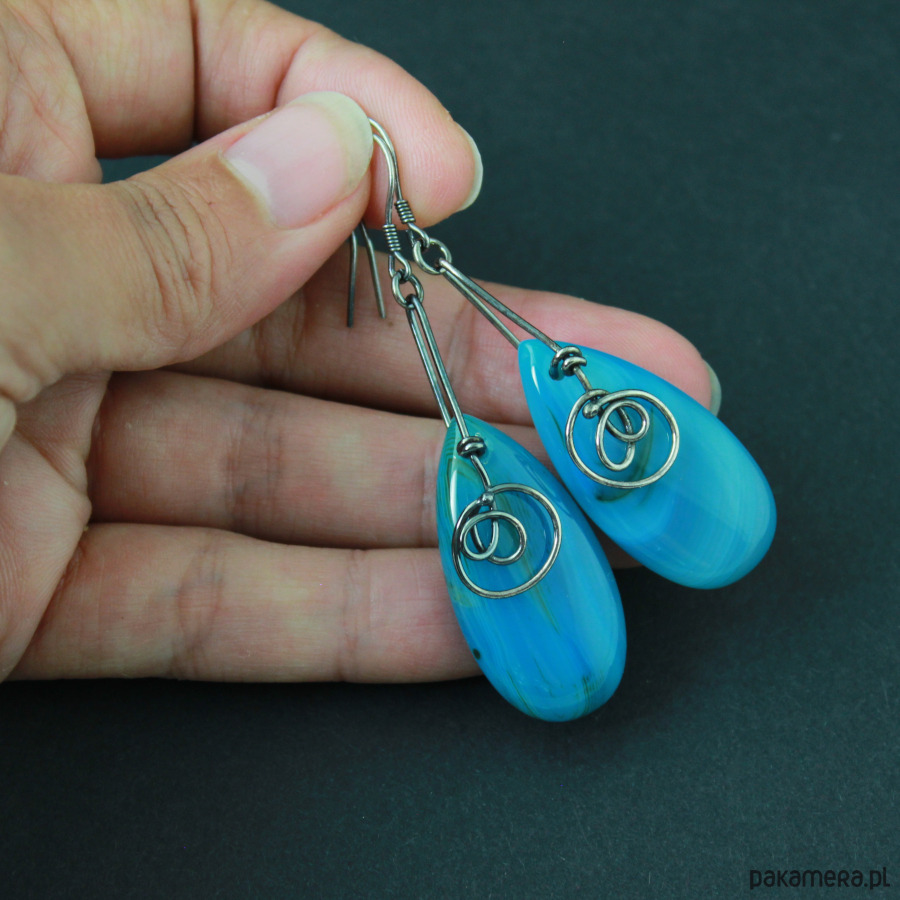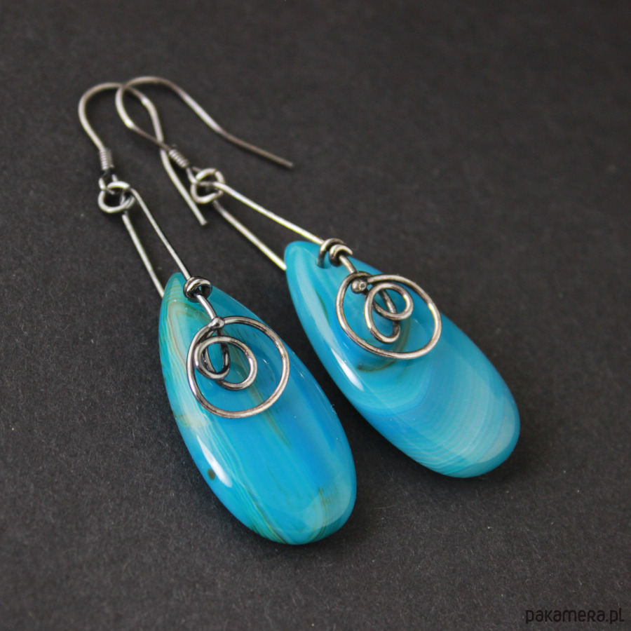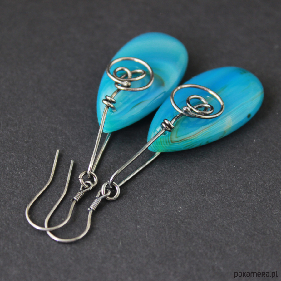 Każdy ruch tych kolczyków przypomina falowanie spokojnego morza o świcie. Krople agatu, wydłużone niczym łzy nieba, lśnią w odcieniach błękitu, turkusu i morskiej piany. Barwy kamienia przenikają się jak warstwy nieba odbite w spokojnej wodzie — od mlecznego lazuru po głębię oceanu. W jego strukturze widać delikatne smugi, które przywodzą na myśl linie horyzontu, jakby natura sama malowała w nim pejzaż ciszy.