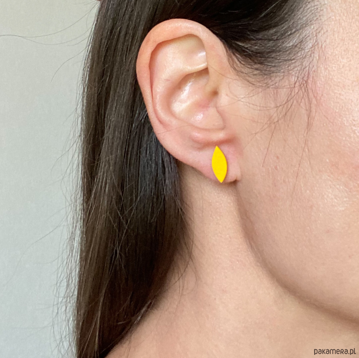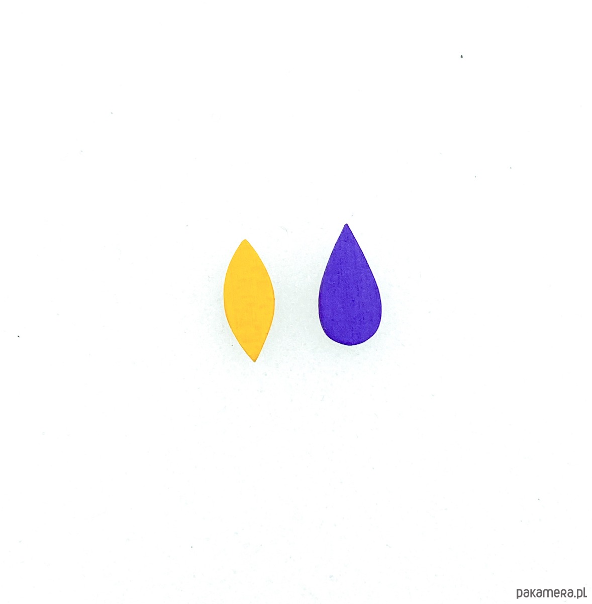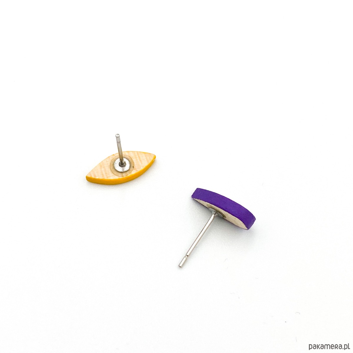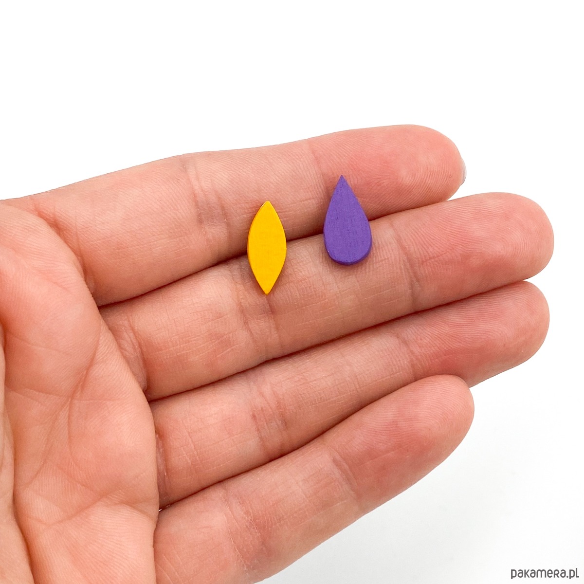 Małe kolczyki sztyfty, wykonane z drewna brzozowego, pokryte farbą akrylową oraz matowym lakierem wodnym.