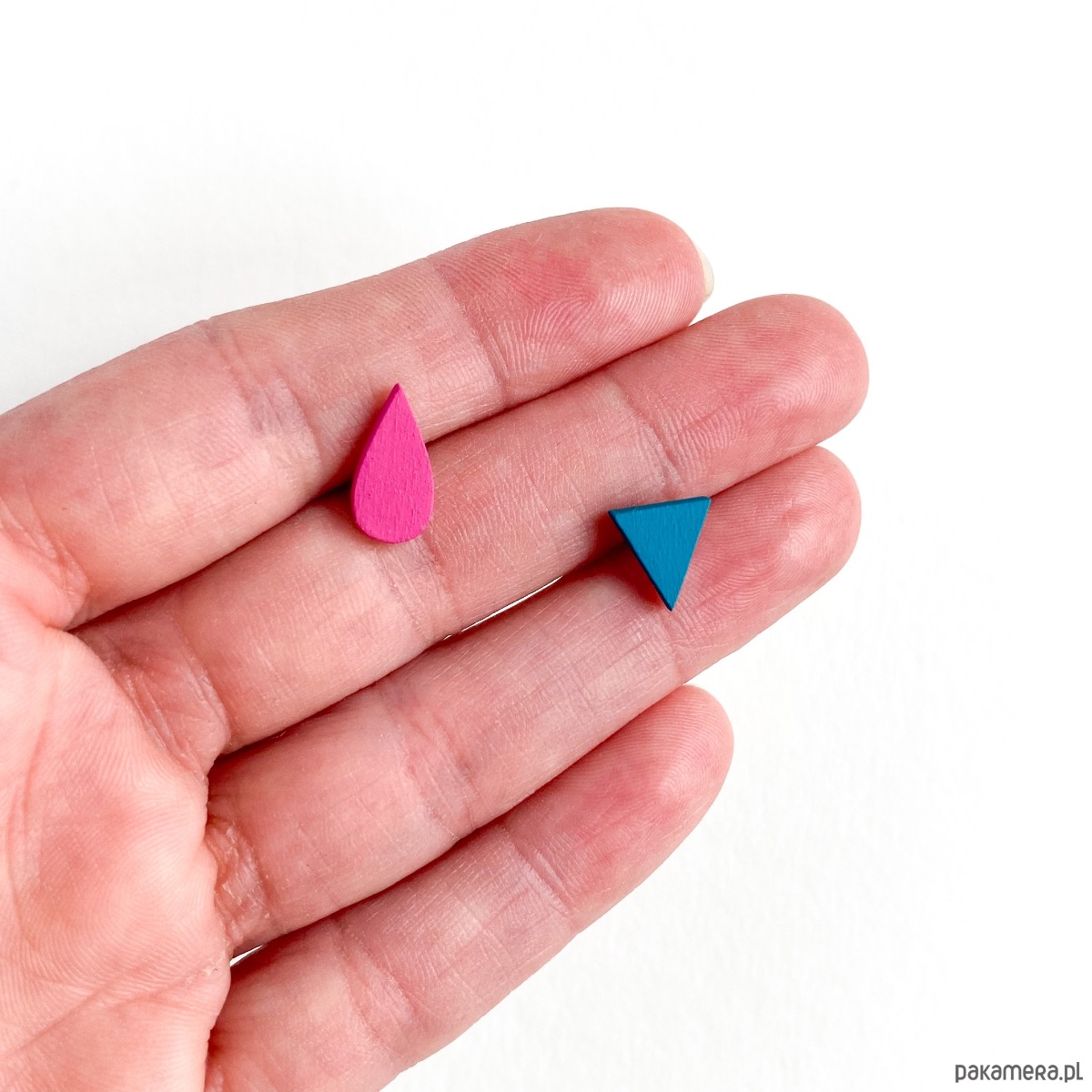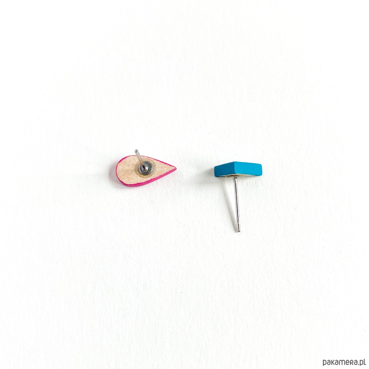 Małe kolczyki sztyfty, wykonane z drewna brzozowego, pokryte farbą akrylową oraz matowym lakierem wodnym.