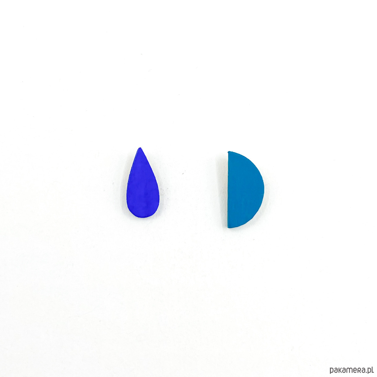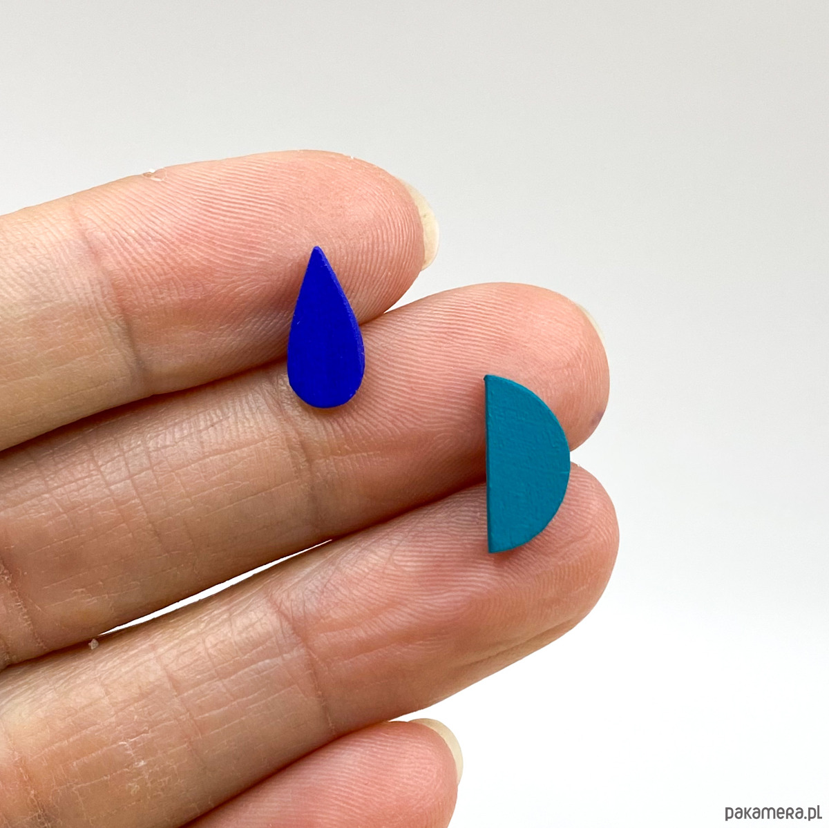 Małe kolczyki sztyfty, wykonane z drewna brzozowego, pokryte farbą akrylową oraz matowym lakierem wodnym.