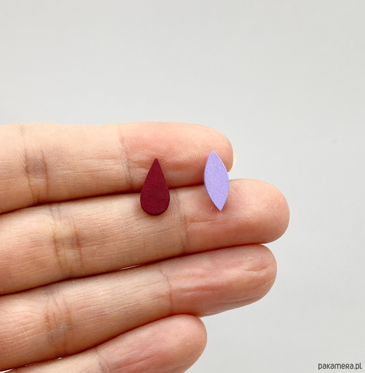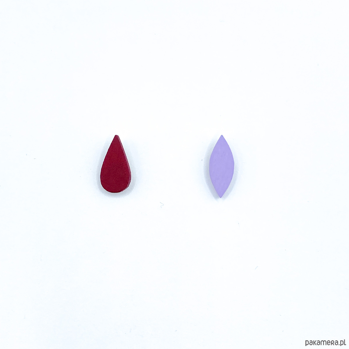 Małe kolczyki sztyfty, wykonane z drewna brzozowego, pokryte farbą akrylową oraz matowym lakierem wodnym.