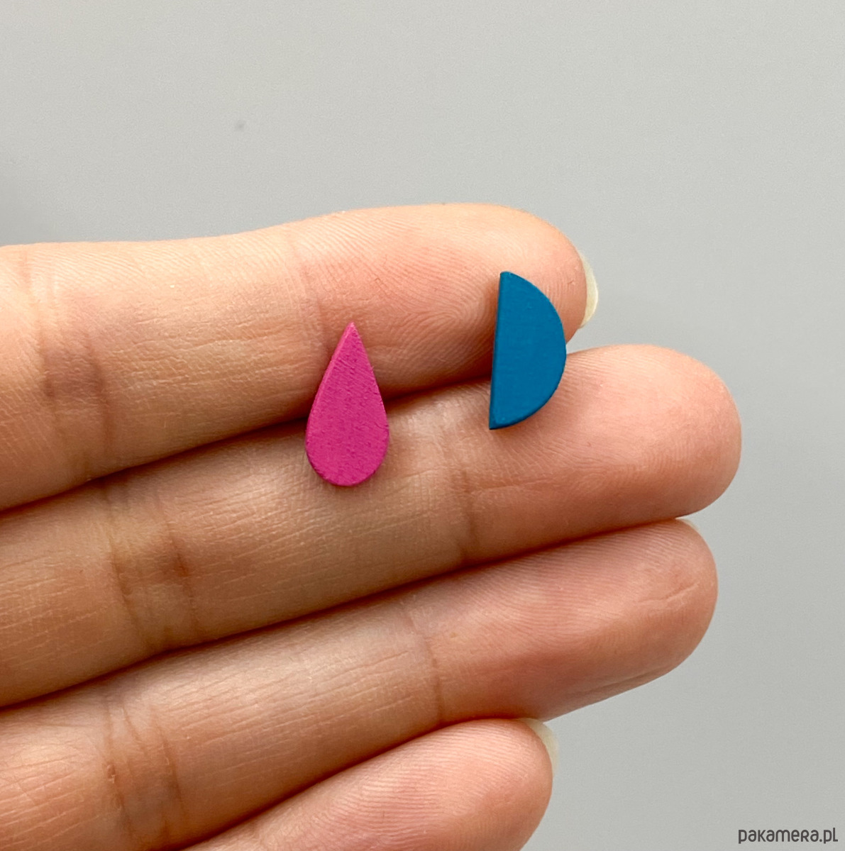 Małe kolczyki sztyfty, wykonane z drewna brzozowego, pokryte farbą akrylową oraz matowym lakierem wodnym.