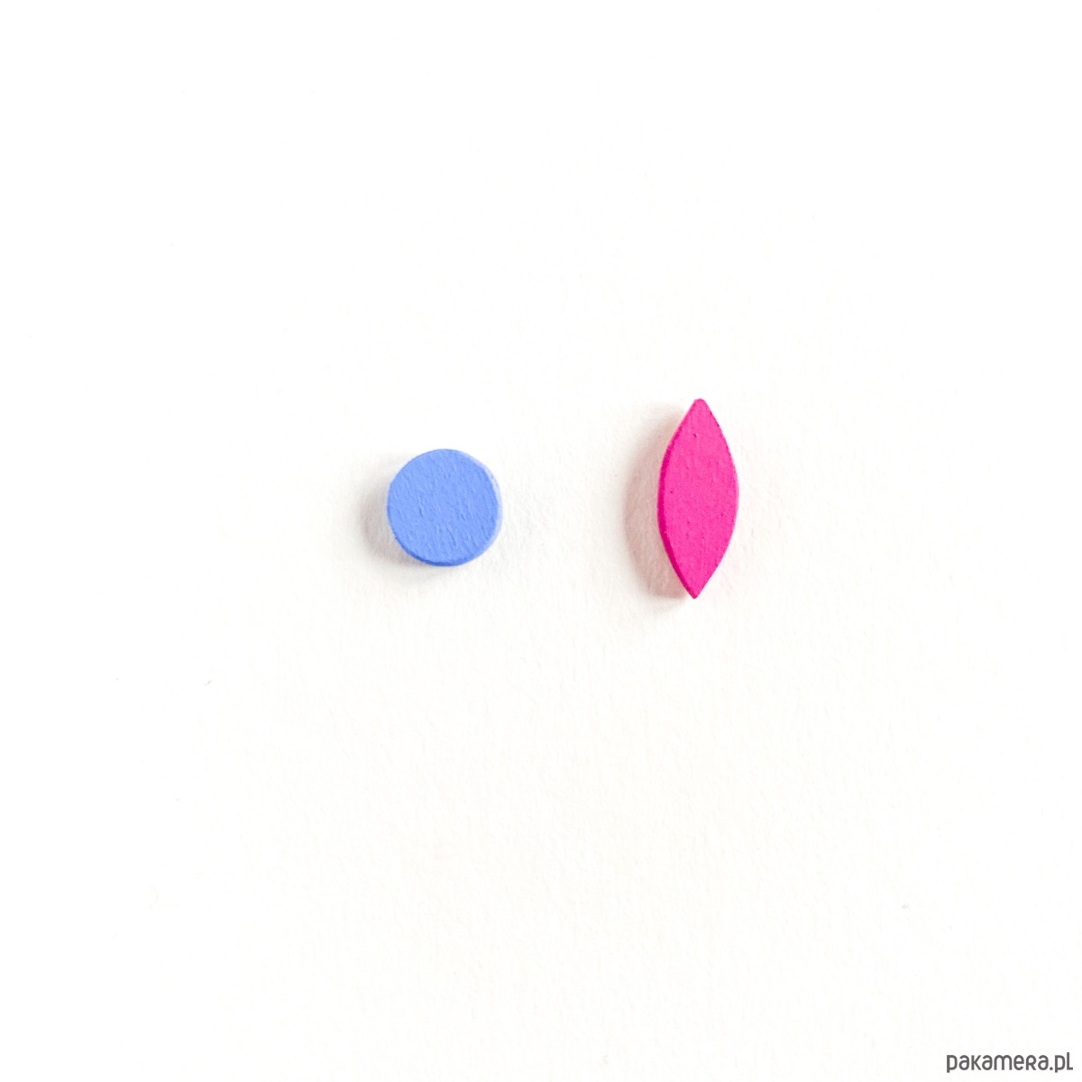 Małe kolczyki sztyfty, wykonane z drewna brzozowego, pokryte farbą akrylową oraz matowym lakierem wodnym.