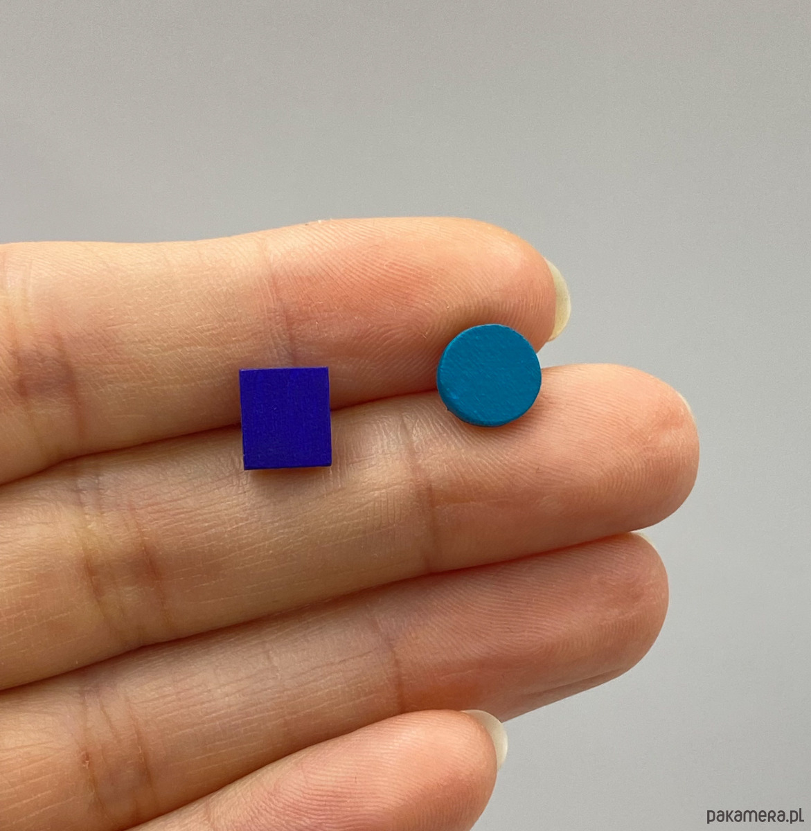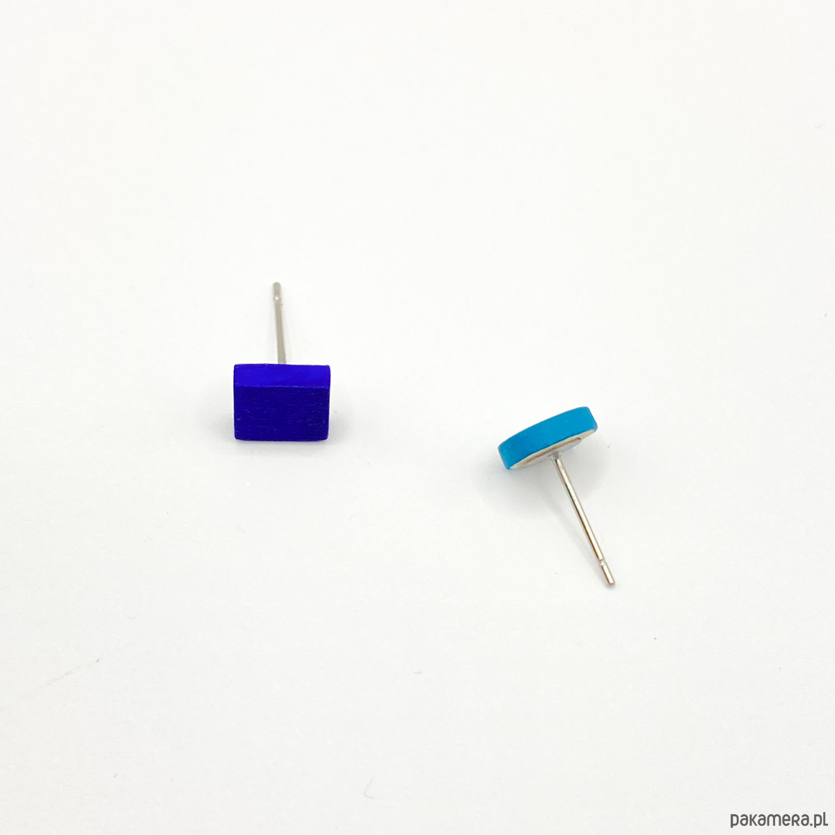 Małe kolczyki sztyfty, wykonane z drewna brzozowego, pokryte farbą akrylową oraz matowym lakierem wodnym.