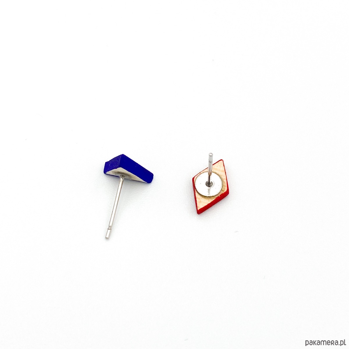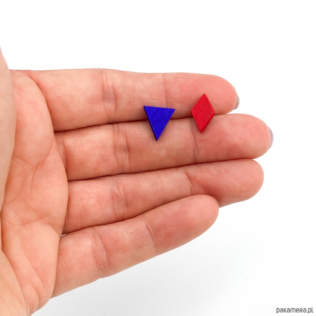 Małe kolczyki sztyfty, wykonane z drewna brzozowego, pokryte farbą akrylową oraz matowym lakierem wodnym.