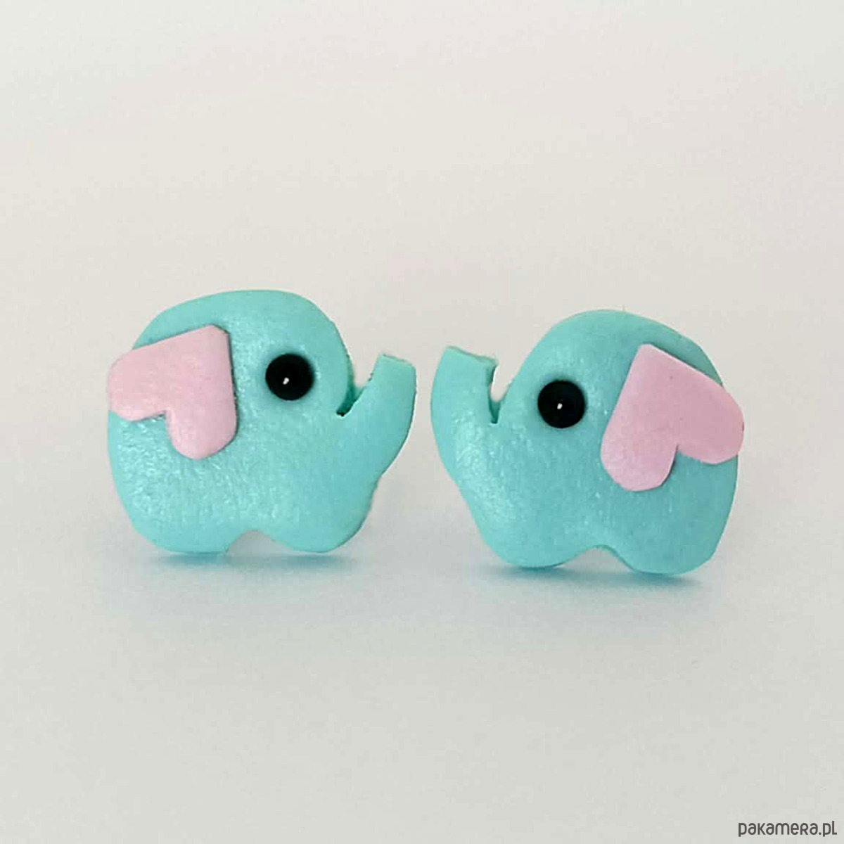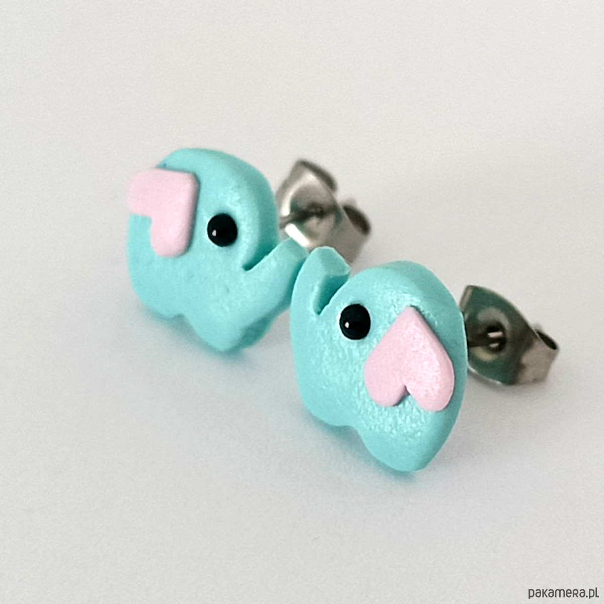 Urocze kolczyki w kształcie małych słoników w niebieskim kolorze z różowymi serduszkami.