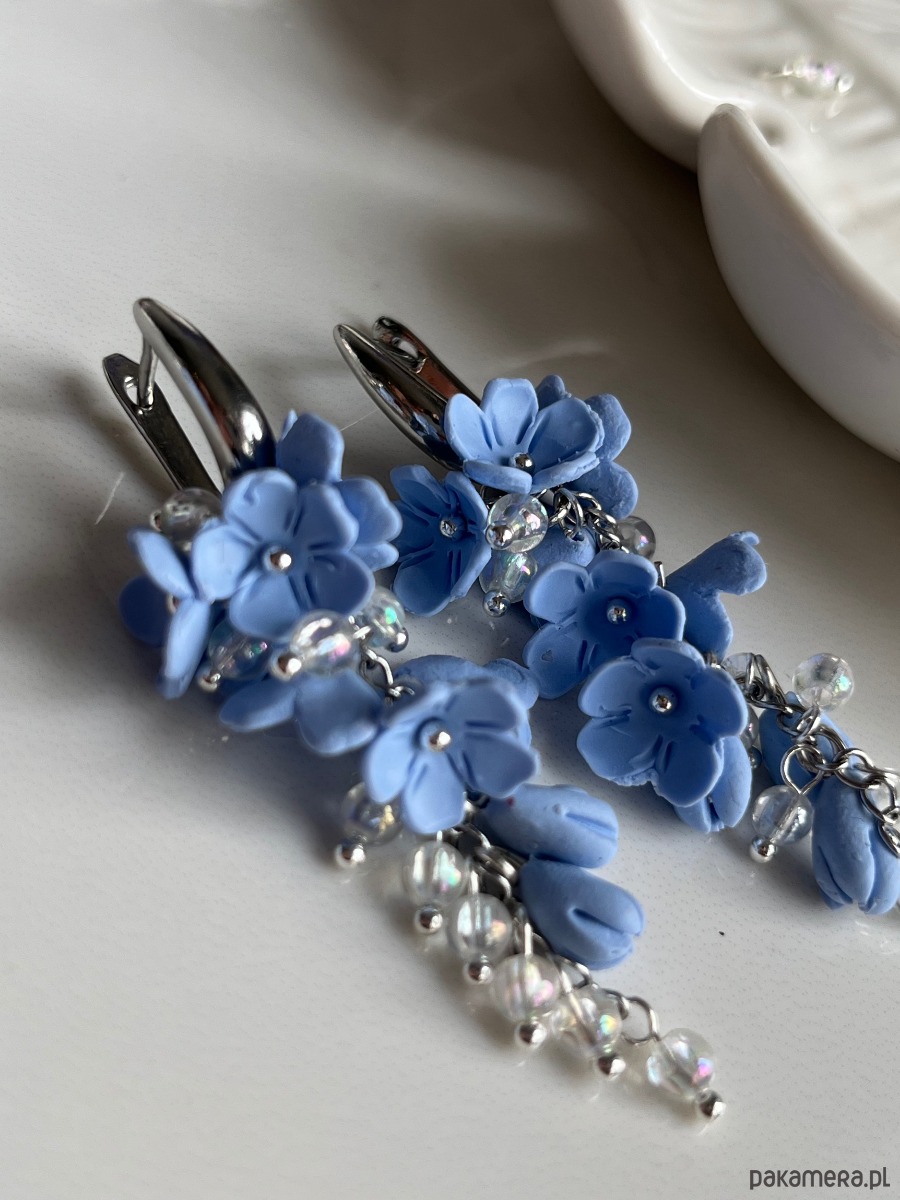 Delikatne kolczyki ręcznie robione z miniaturowymi kwiatami w chłodnym, niebieskim odcieniu. Przestrzenne płatki tworzą efekt żywego bukietu, a subtelne zawieszki z przezroczystymi koralikami i srebrzystymi akcentami dodają lekkości oraz delikatnego blasku w ruchu.