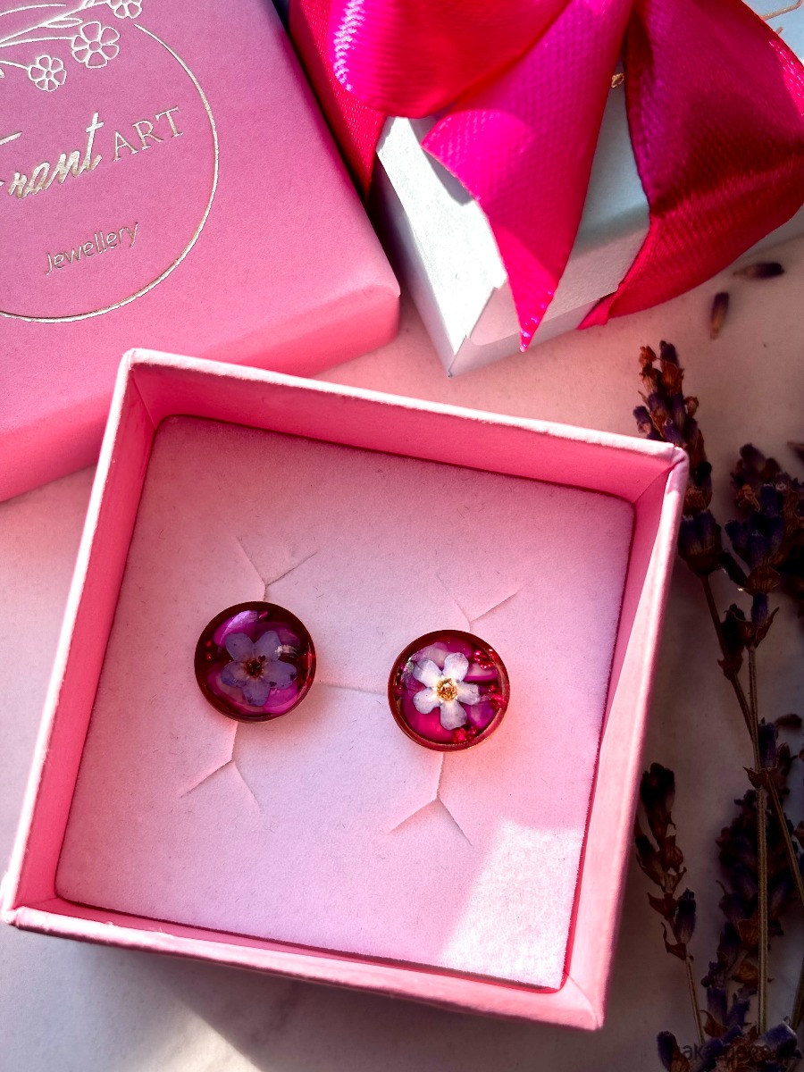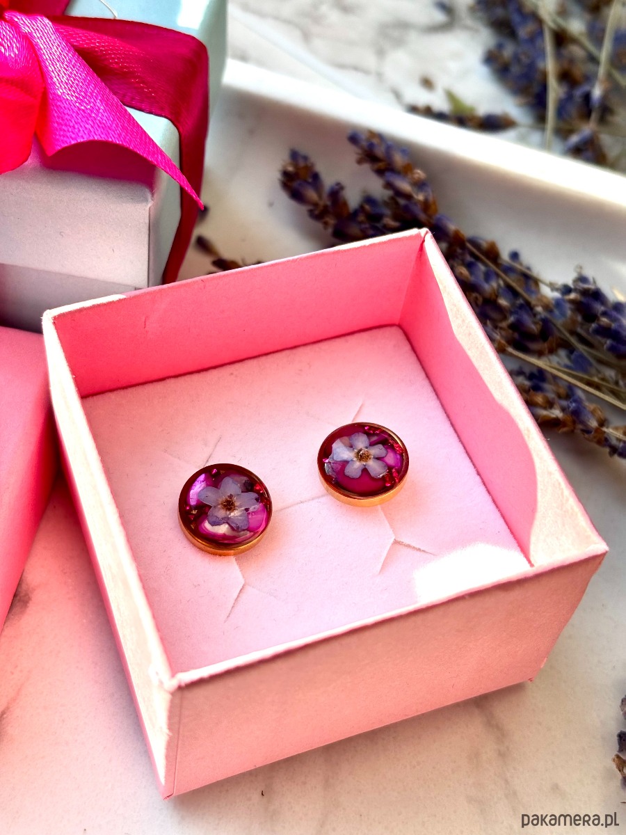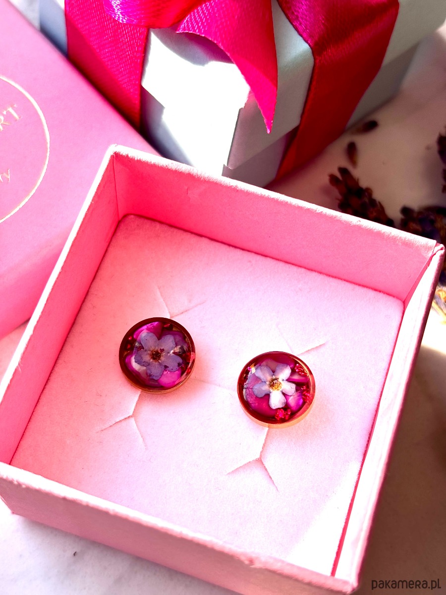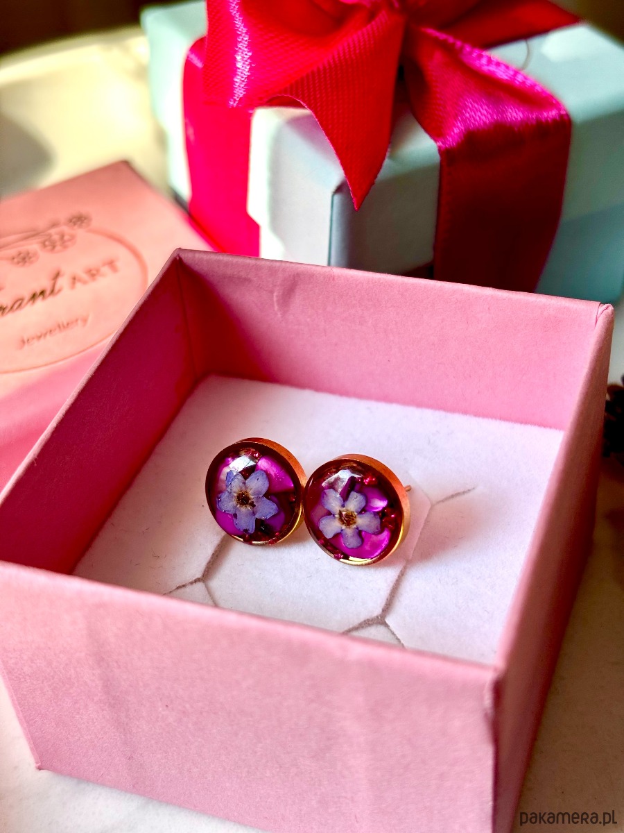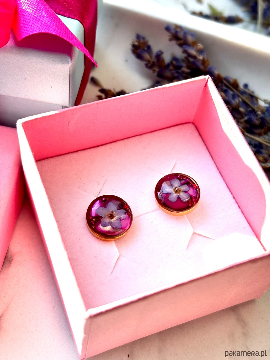 Ręcznie wykonane kolczyki z okrągłymi zawieszkami . Biżuteria wykonana jest z wyselekcjonowanych płatków kwiatów niezapominajki, na tle z kawałków różowych muszli i płatków masy perłowej. Kolczyki pięknie prezentują się na uchu, są efektowne i wyjątkowo lekkie co stanowi komfort noszenia.