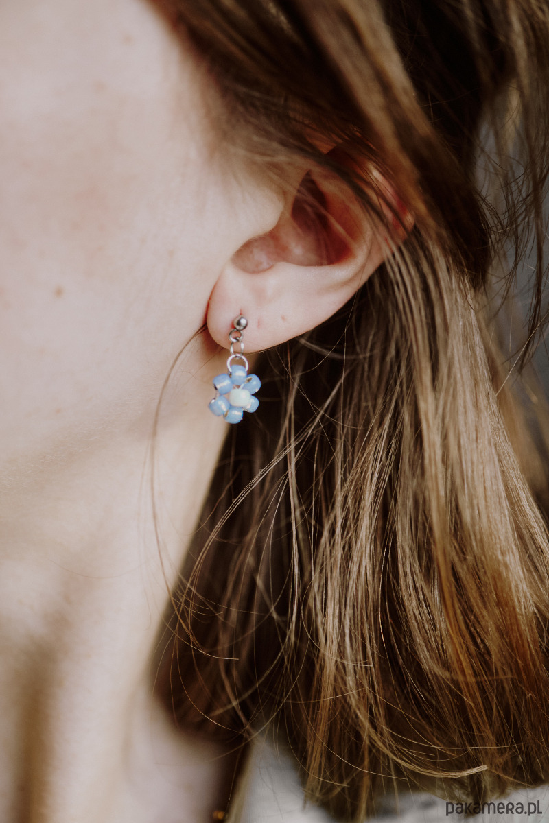 Bajkowe kolczyki ze szklanych, japońskich koralików zaplecionych w kształt kwiatków. Piękny kolor baby blue.