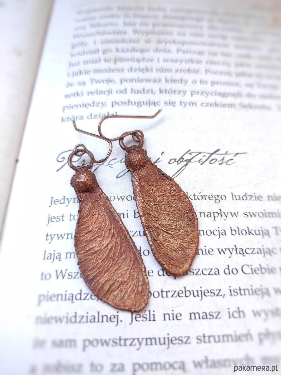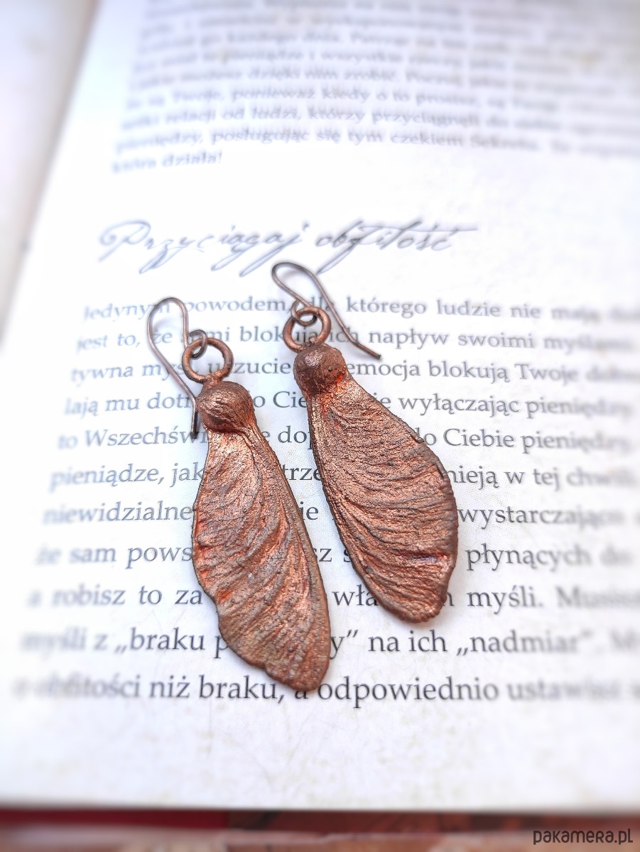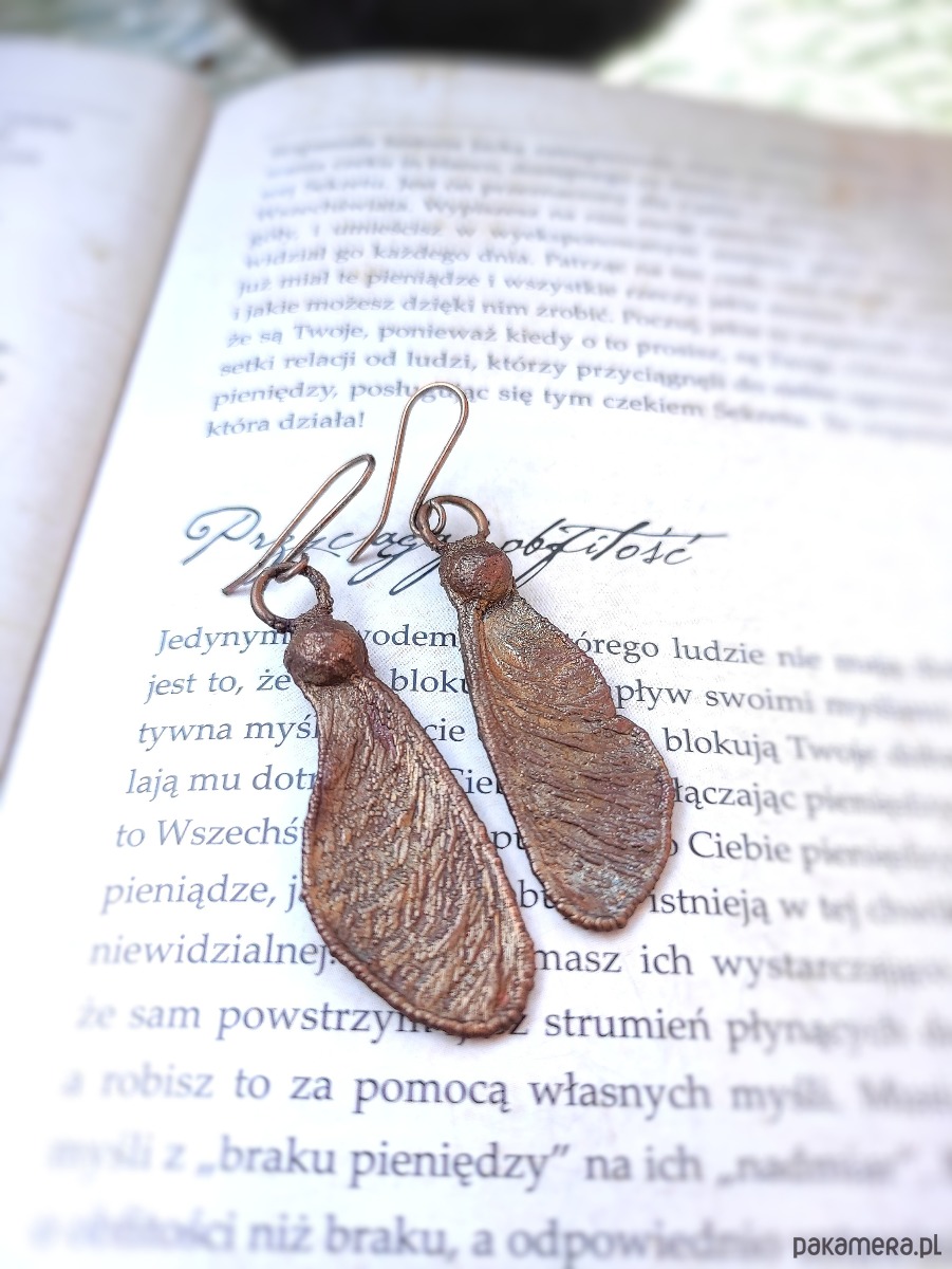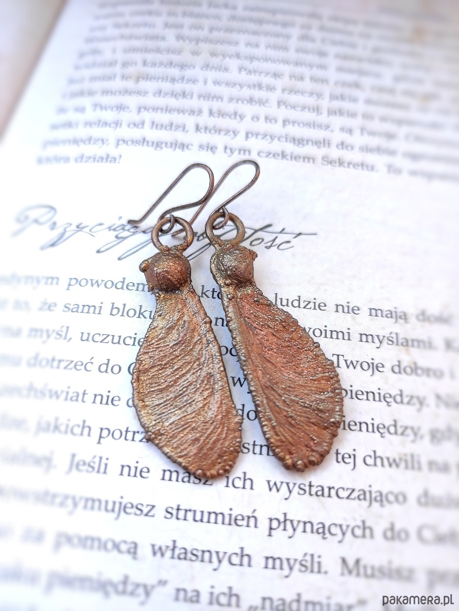 Te kolczyki nie powstały w fabryce. Urodziły się w lesie – z nosków klonu, które kiedyś wirowały w powietrzu jak skrzydła elfów. Zebrane z szacunkiem, otulone miedzią w procesie elektroformowania, zamieniły się w biżuterię, która łączy świat natury z opowieścią zaklętą w metalu.
