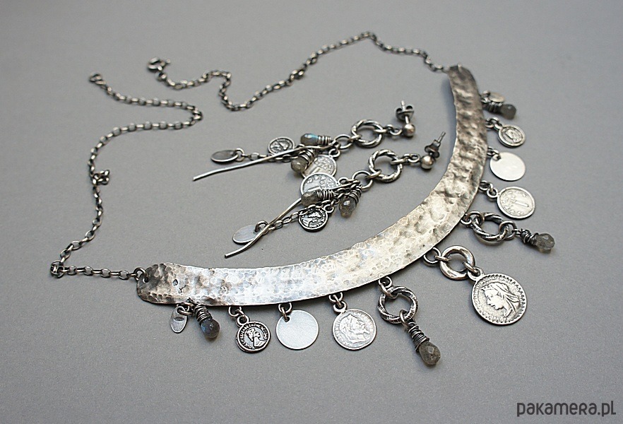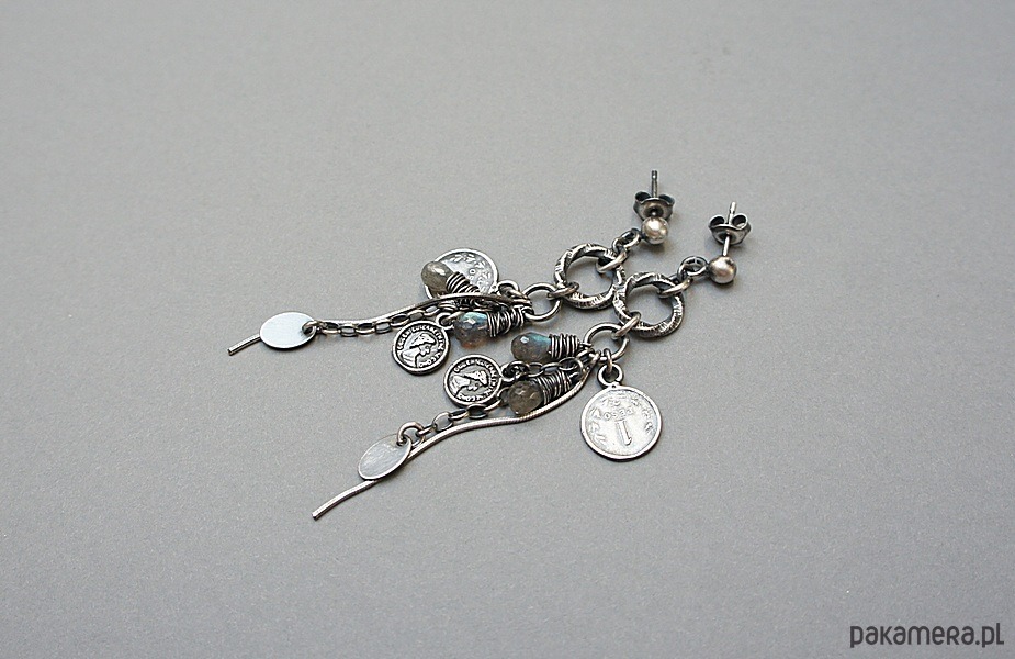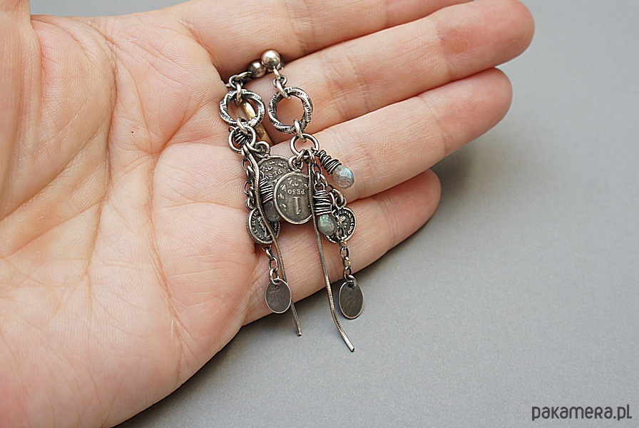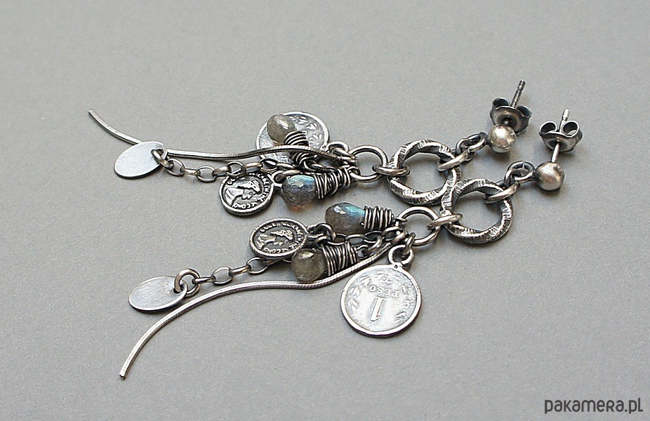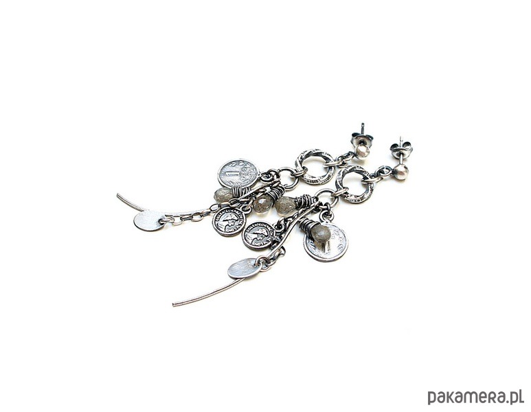 Kolczyki wykonane ze srebra [pr. 925 ] w połączeniu z fasetowanymi kropelkami labradorytów [7-8mm] oraz srebrnymi imitacjami monet. Całość oksydowana i przetarta. Całkowita długość kolczyków wraz z łańcuszkami 7cm. Biżuteria ozdobnie zapakowana.