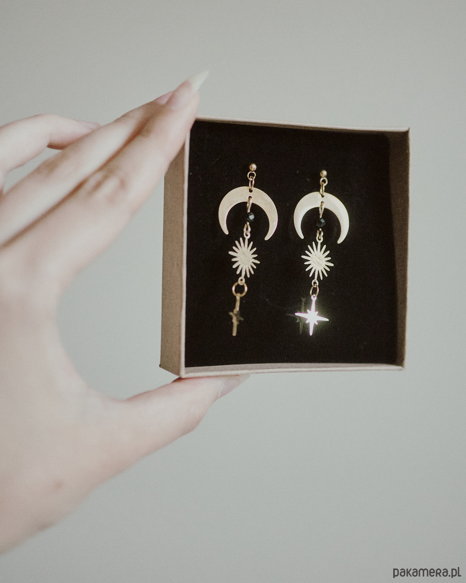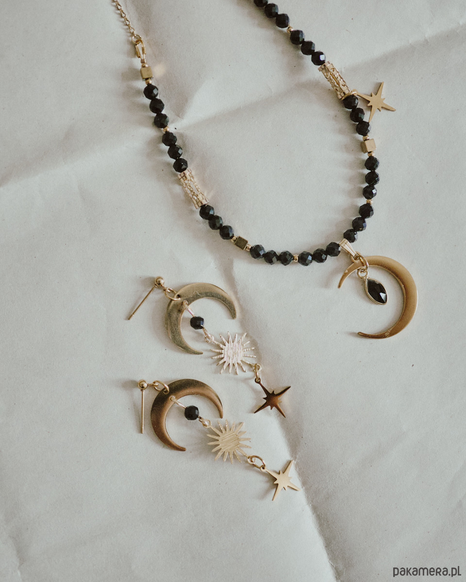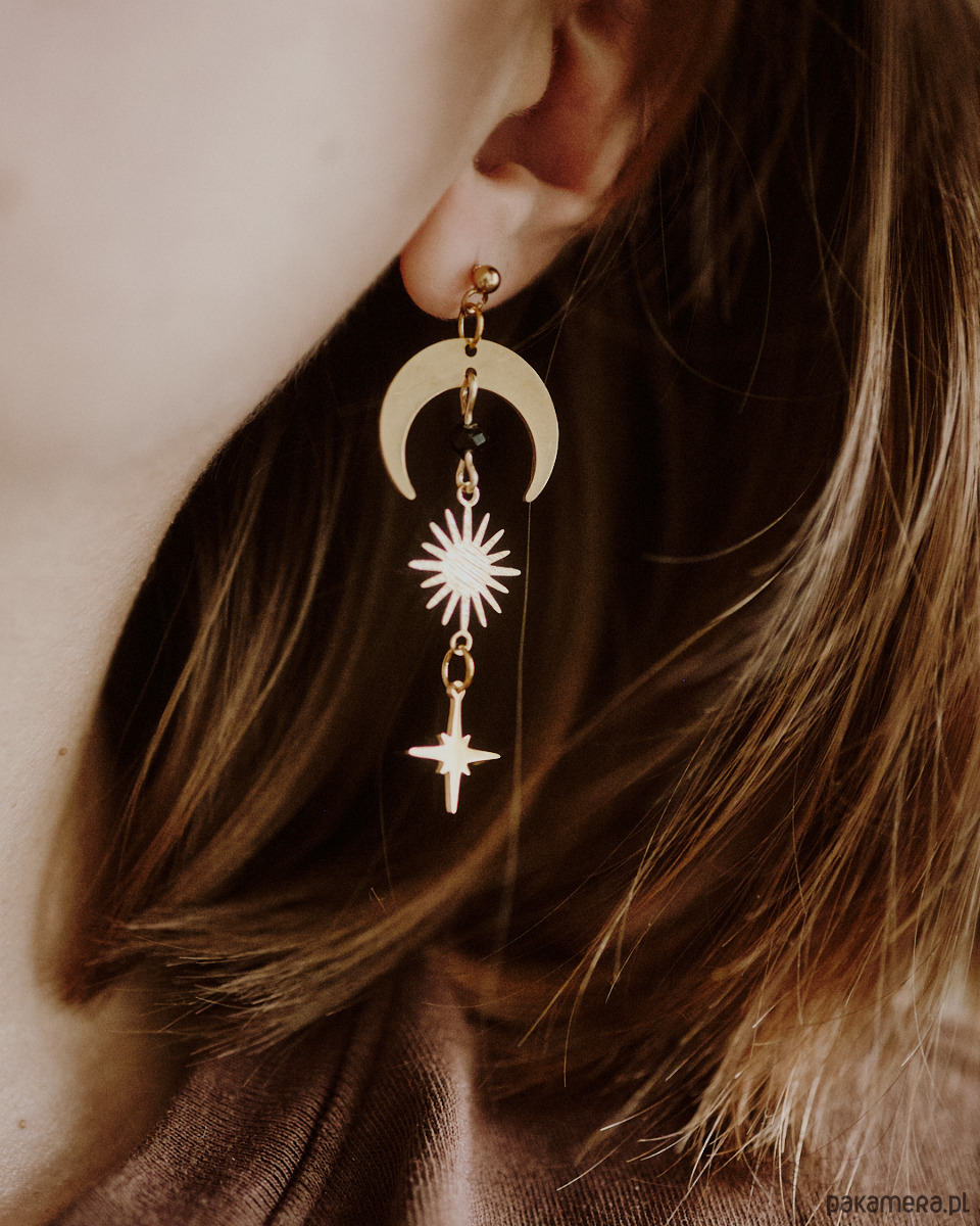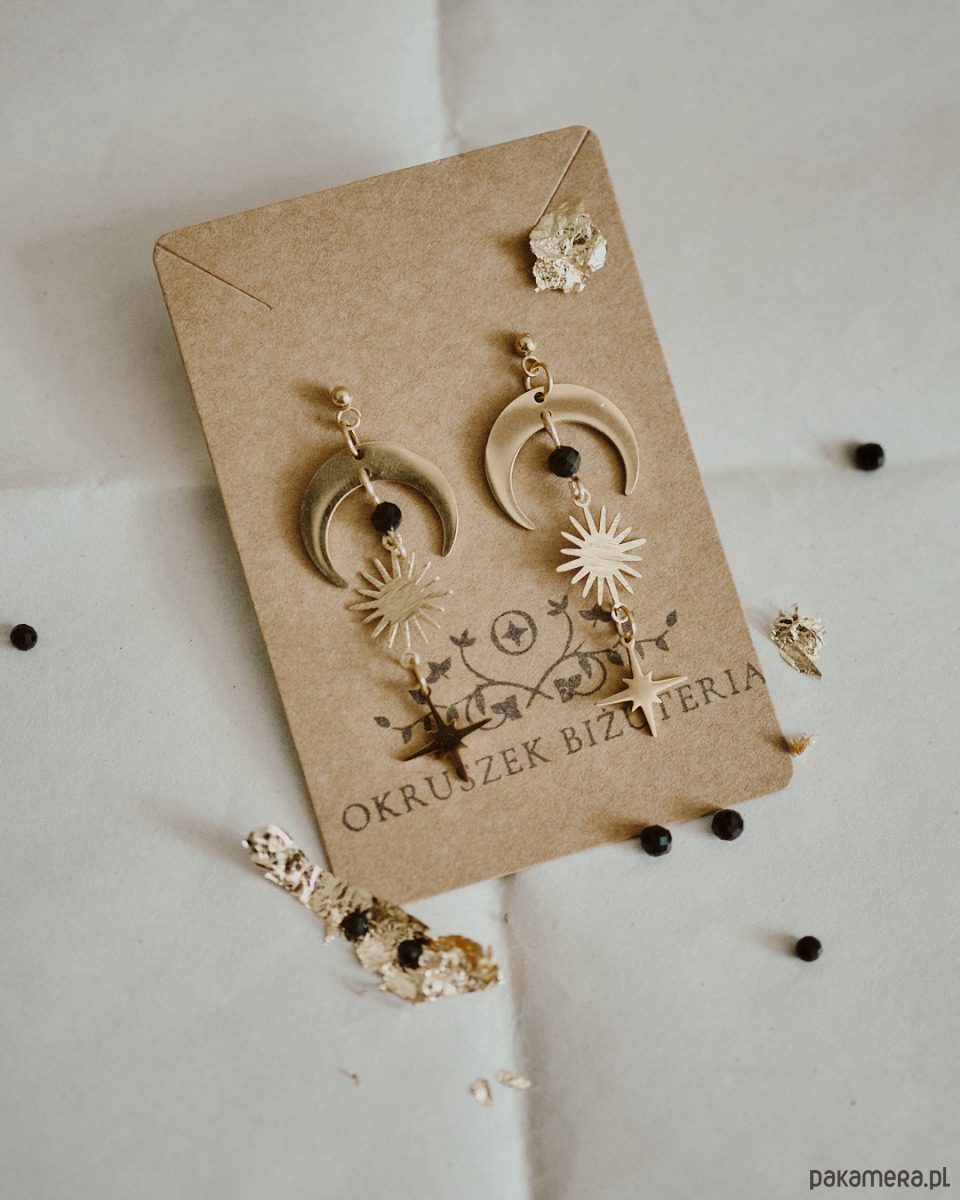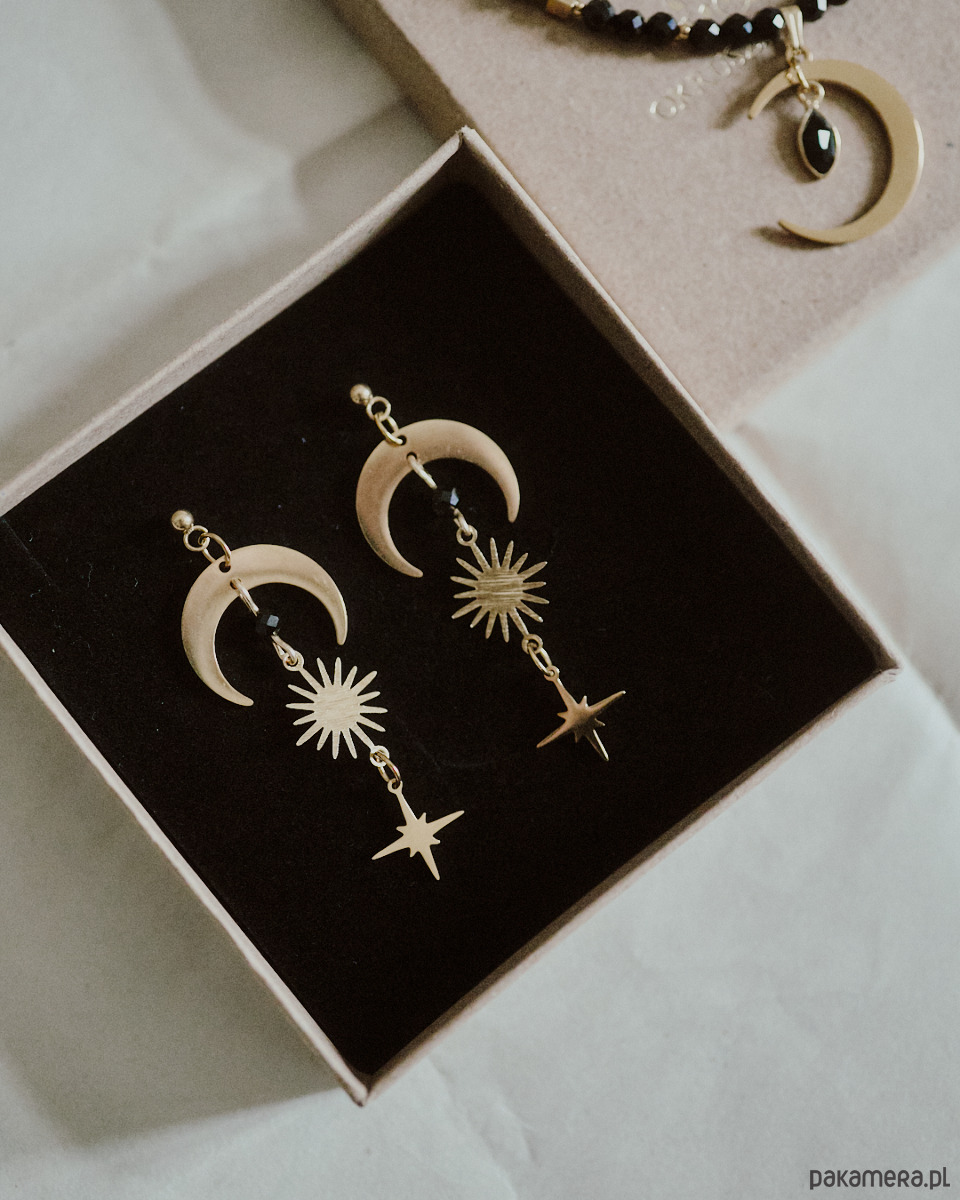 Kolczyki z motywem księżyca, słońca, gwiazdy z kuleczkami czarnego onysku . ݁₊ ⊹ . ݁˖ . ݁