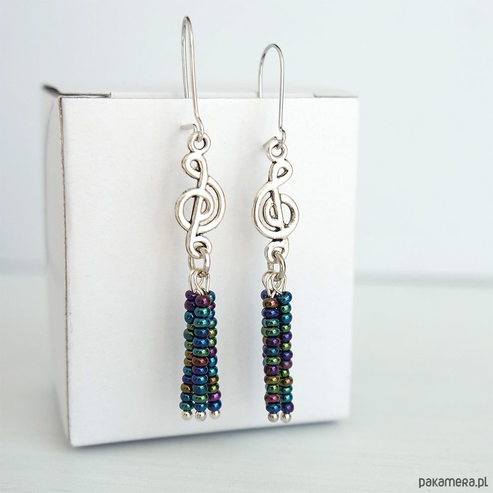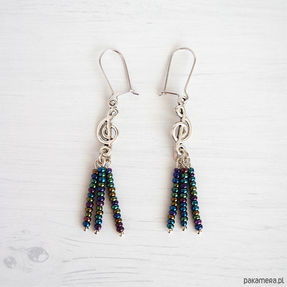Delikatne, unikatowe kolczyki wykonane z zawieszek metalowych w kształcie nutek oraz malutkich kolorowych, metalicznych koralików.
