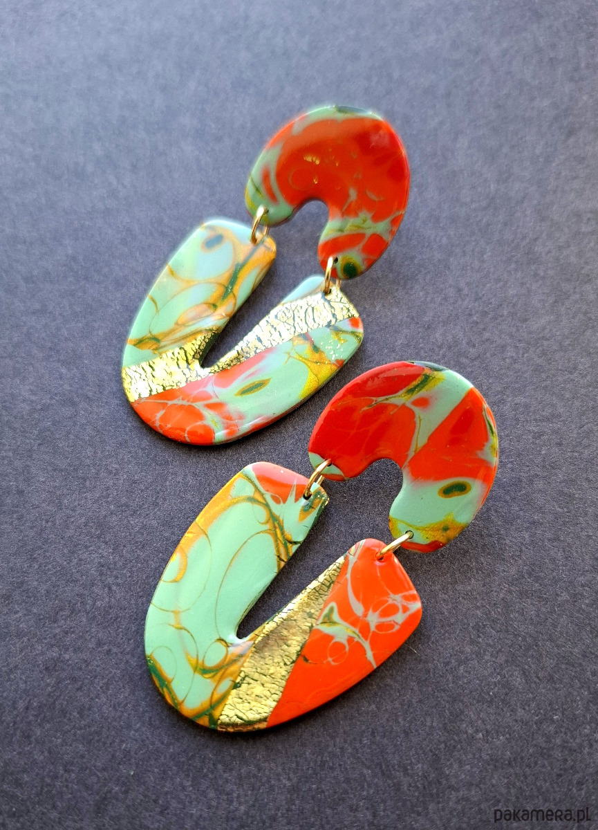 Lekkie, wyraziste sztyfty wykonane z wysokiej jakości glinki polimerowej. Sztyfty pozłacane i nieuczulające. Wymiary kolczyków: długość całkowita: 5,8 cm, szerokość max. 3,2 cm.