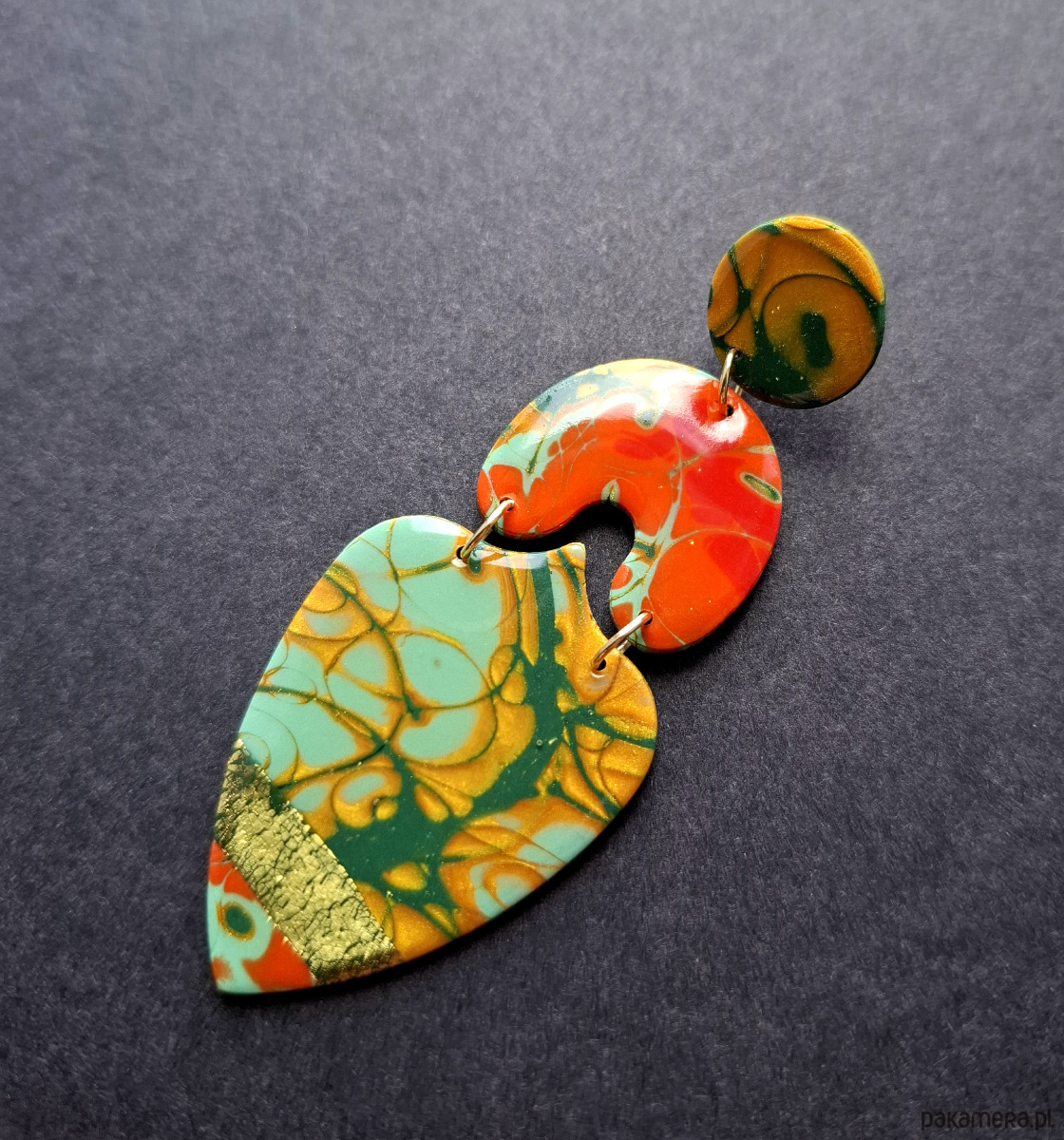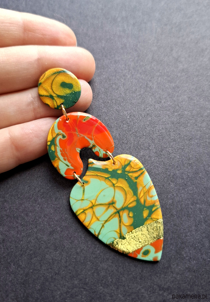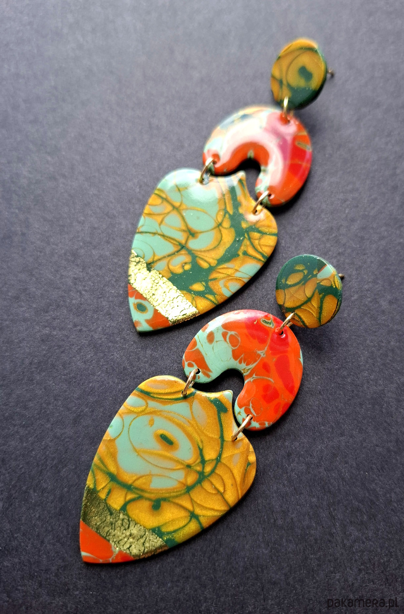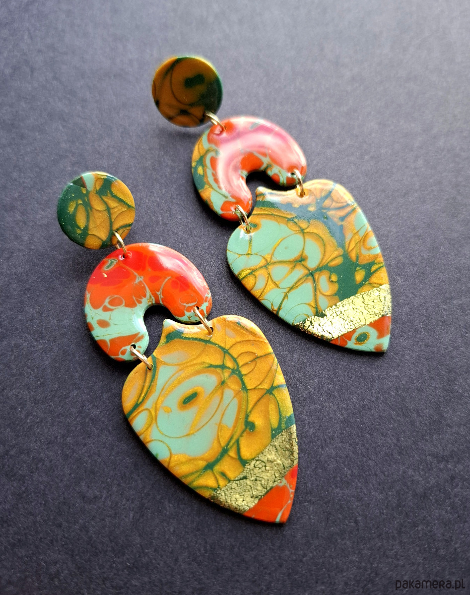 Lekkie, wyraziste sztyfty wykonane z wysokiej jakości glinki polimerowej. Sztyfty pozłacane i nieuczulające. Wymiary kolczyków: długość całkowita: 8 cm, szerokość max. 3 cm.