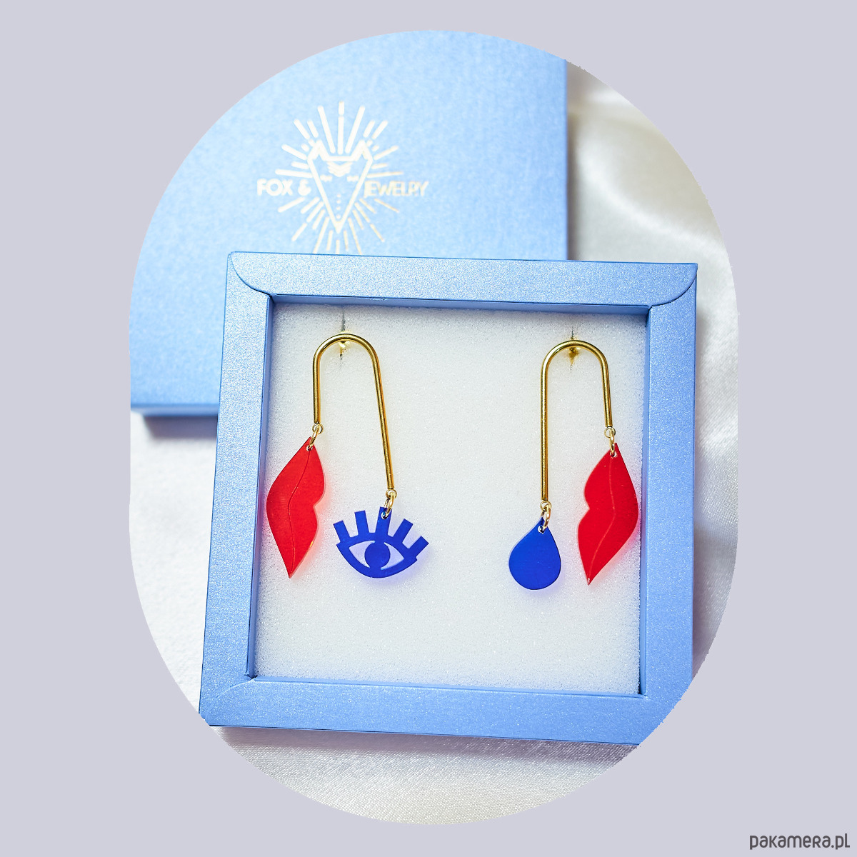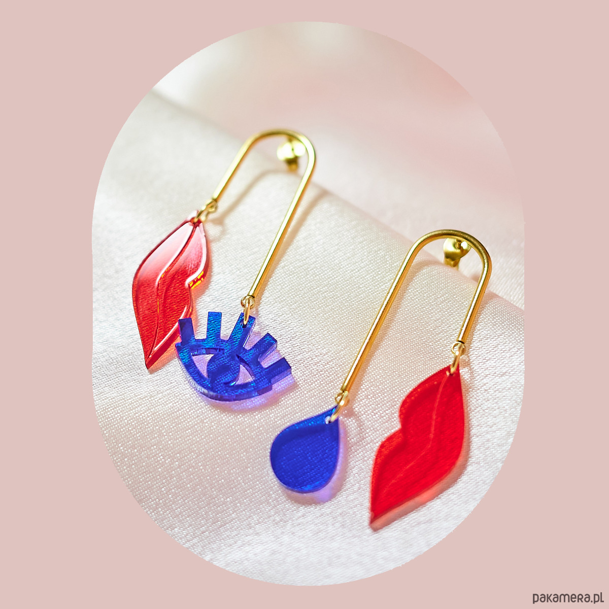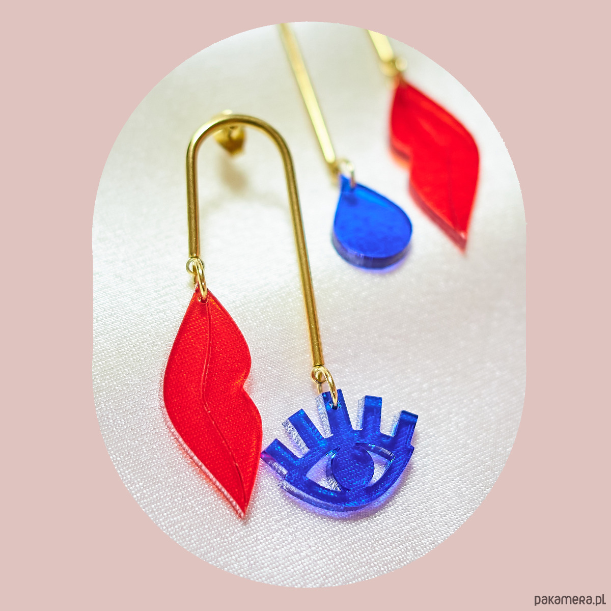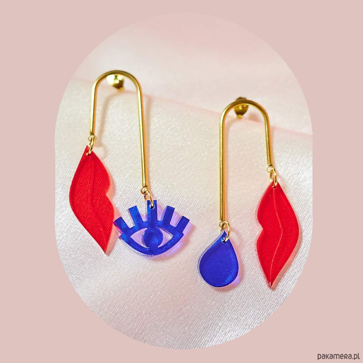 Kolczyki projektuję w swojej małej wrocławskiej Pracowni, wycinam je na własnym laserze CNC. Użyty materiał to transparentna plexi o grubości 3mm w kolorze czerwonym i kobaltowym.