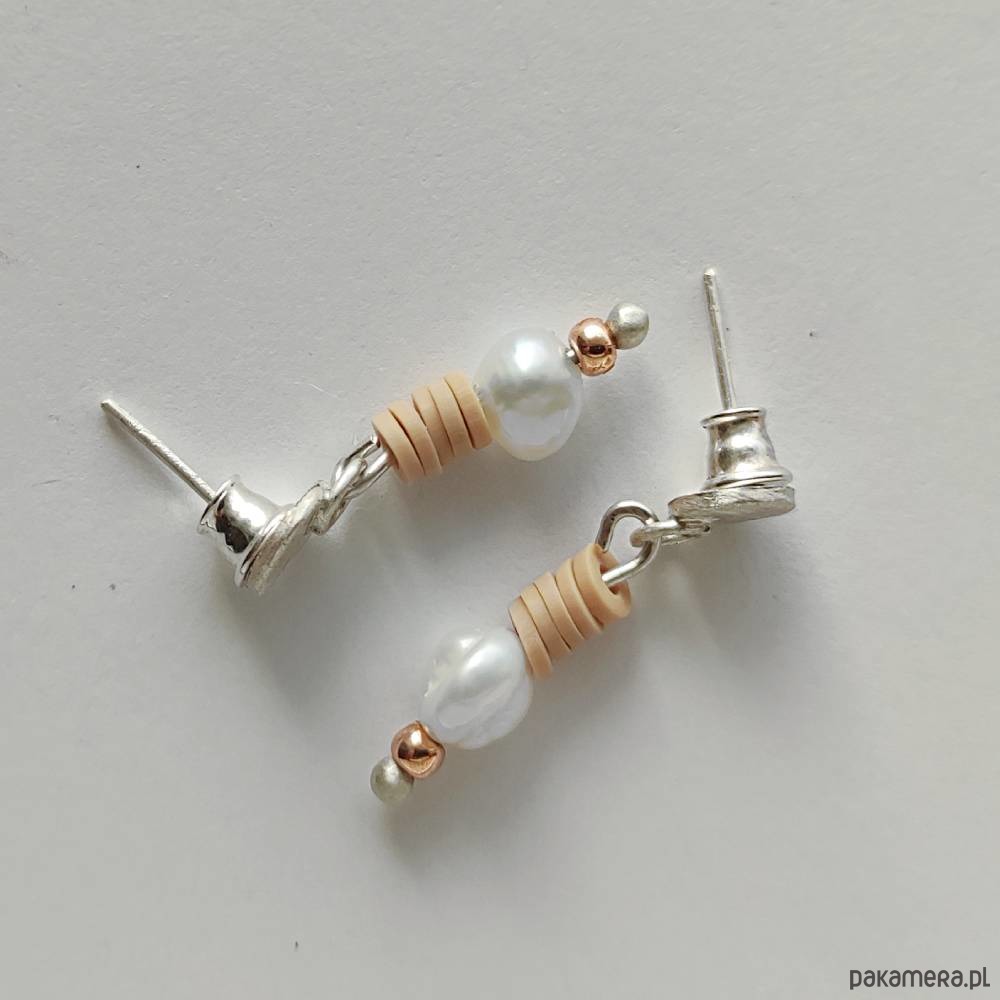 Oryginalność i prostota. OKRĄG - kształt doskonały. Kolekcję cechuje elegancja i prostota jak również ekstrawagancja i indywidualizm. Kolczyki na sztyftach wykonane są z : srebro, Perła hodowlana (0k. 0,8 cm), koraliki Katsuki (średnicy 4mm), szklane koraliki.Srebro - próby 0,925, zmatowione, . Długość kolczyków - ok. 3 cm