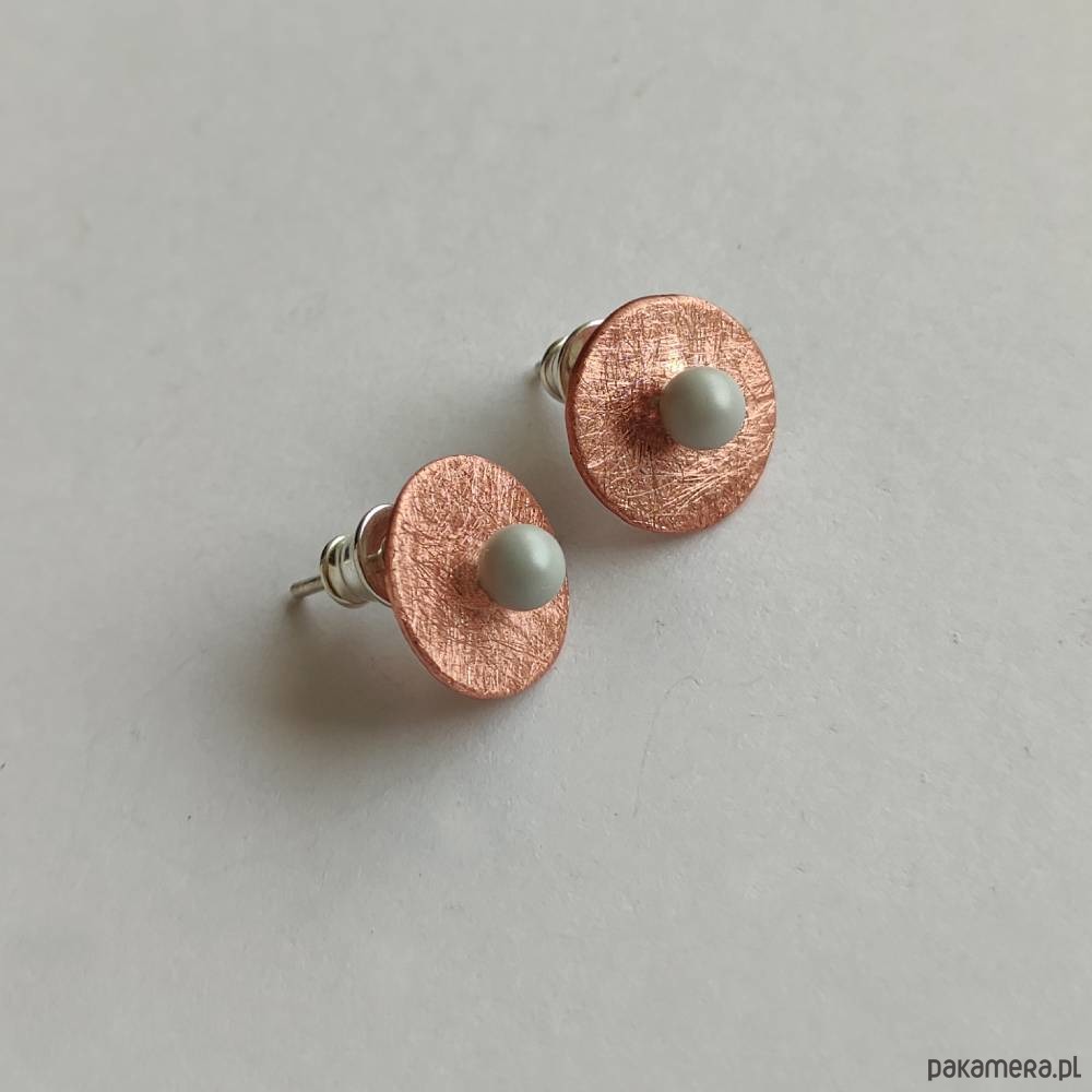 Oryginalność i prostota. OKRĄG - kształt doskonały. Kolekcję cechuje elegancja i prostota jak również ekstrawagancja i indywidualizm. Kolczyki na sztyftach wykonane są z : srebro, swarovski perła( ok 6mm) Srebro - próby 0,925,miedź - zmatowiona, . Długość kolczyków - ok. 1,2cm