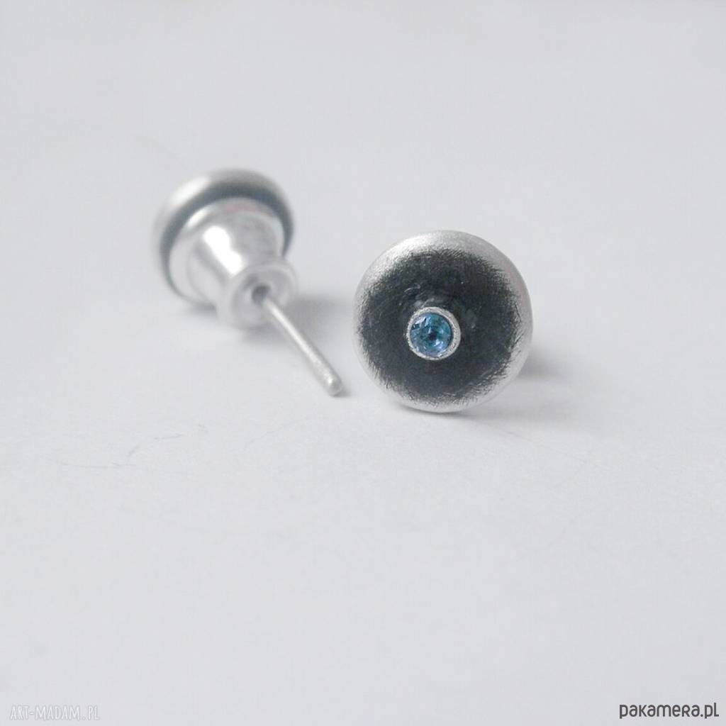 Oryginalność i prostota. OKRĄG - kształt doskonały. Kolekcję cechuje elegancja i prostota jak również ekstrawagancja i indywidualizm. Kolczyki na sztyftach wykonane są ze srebro, akwamaryn. Srebro - próby 0,925, zmatowione, oksydowane. Średnica kolczyka - 0,7 cm