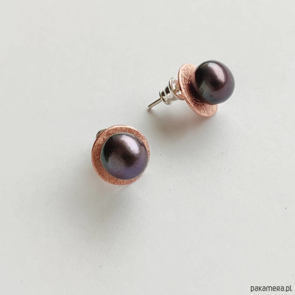 Oryginalność i prostota. OKRĄG - kształt doskonały. Kolekcję cechuje elegancja i prostota jak również ekstrawagancja i indywidualizm. Kolczyki na sztyftach wykonane są z : srebro, Perła granatowa ( 0k 9 mm)Srebro - próby 0,925,miedź - zmatowiona, . Długość kolczyków - ok. 1,2cm