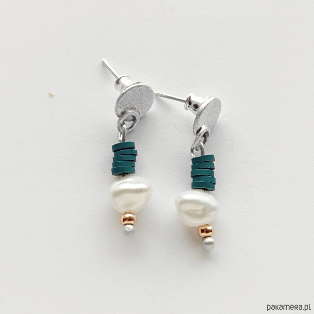 Oryginalność i prostota. OKRĄG - kształt doskonały. Kolekcję cechuje elegancja i prostota jak również ekstrawagancja i indywidualizm. Kolczyki na sztyftach wykonane są z : srebro, Perła hodowlana (0k. 0,8 cm), koraliki Katsuki (średnicy 4mm), szklane koraliki.Srebro - próby 0,925, zmatowione, . Długość kolczyków - ok. 3 cm